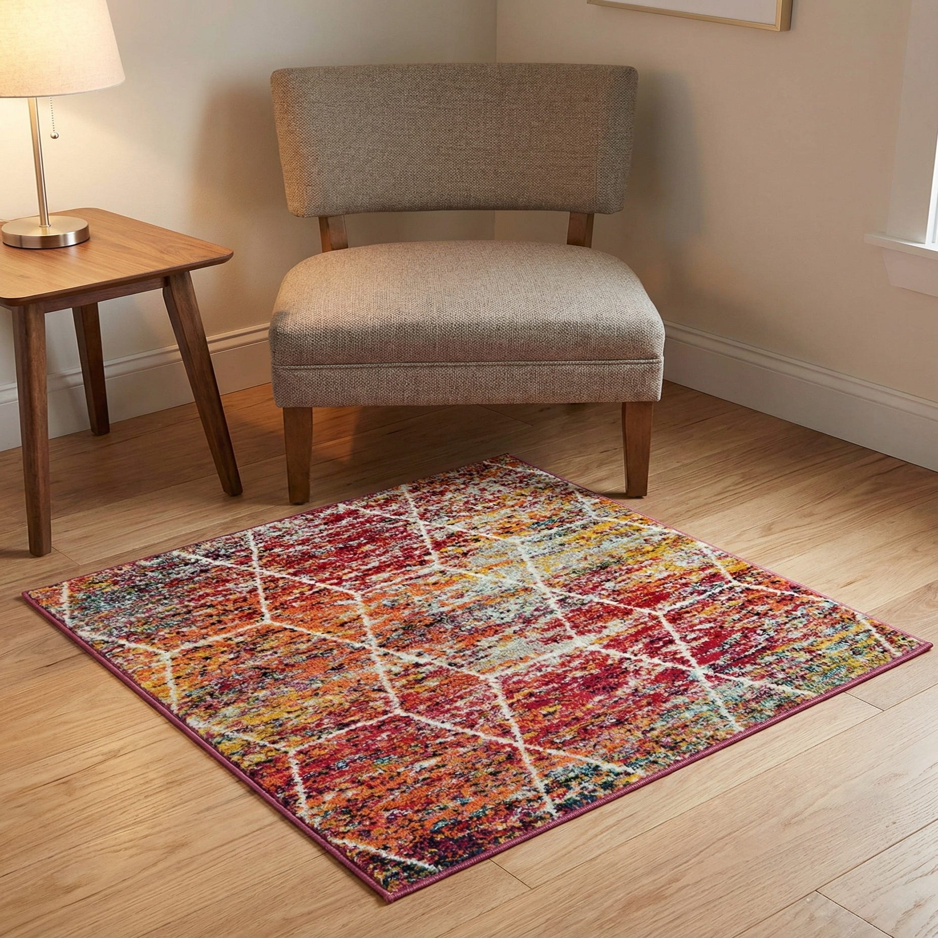 A vibrant 3'x3' square rug featuring a modern trellis pattern in multi-colored hues of red, orange, yellow, and blue.