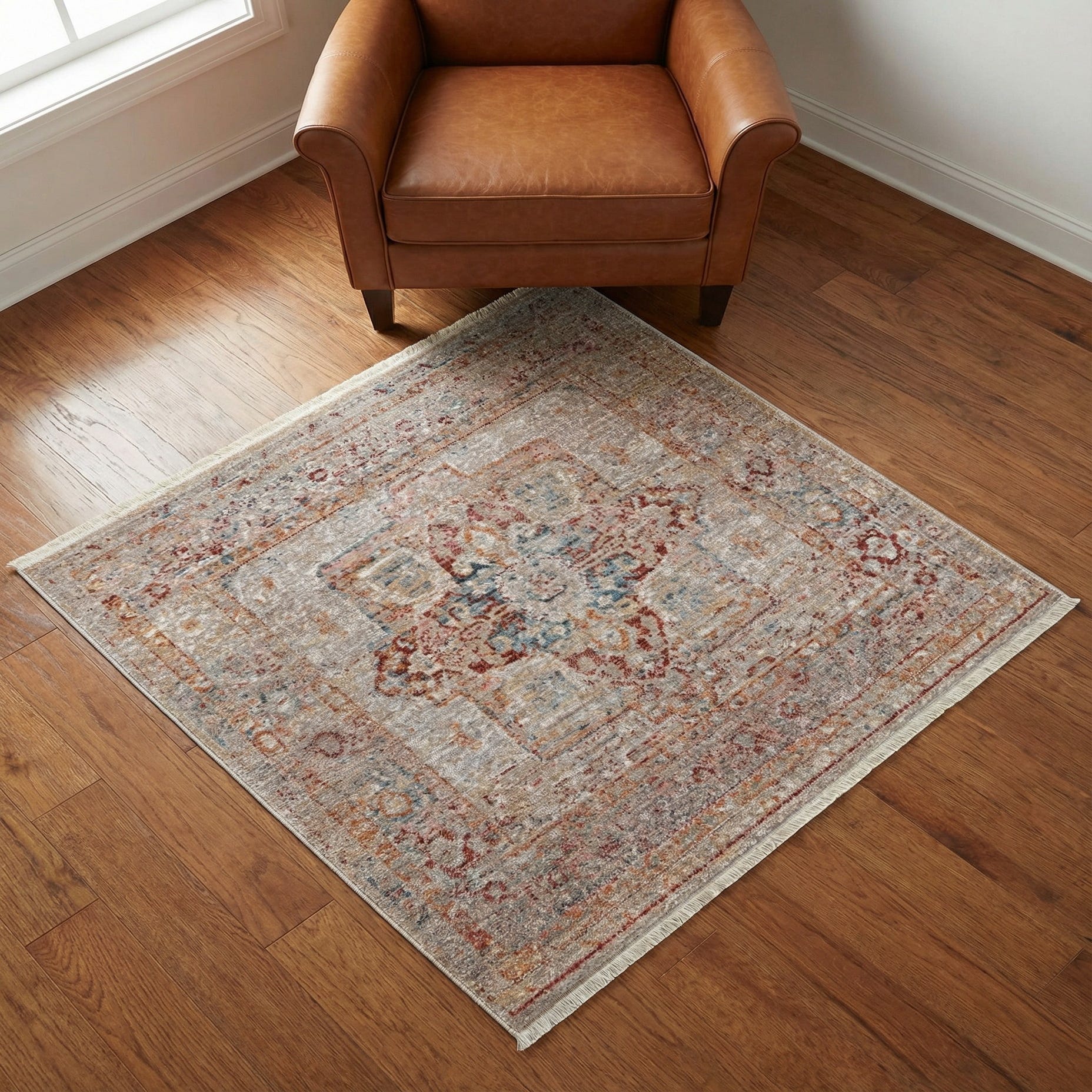 A softly worn central medallion and layered ornamental borders create a vintage-inspired pattern that balances traditional motifs with a relaxed, lived-in look. The background color is Multi, with a blended palette of beige, gray, ivory, navy blue, orange and red that give the design depth and subtle contrast. The surface has a low, dense pile in machine made construction of 100% polyester, offering a smooth, slightly plush hand and a faint, muted sheen that complements the rug’s distressed detailing.
