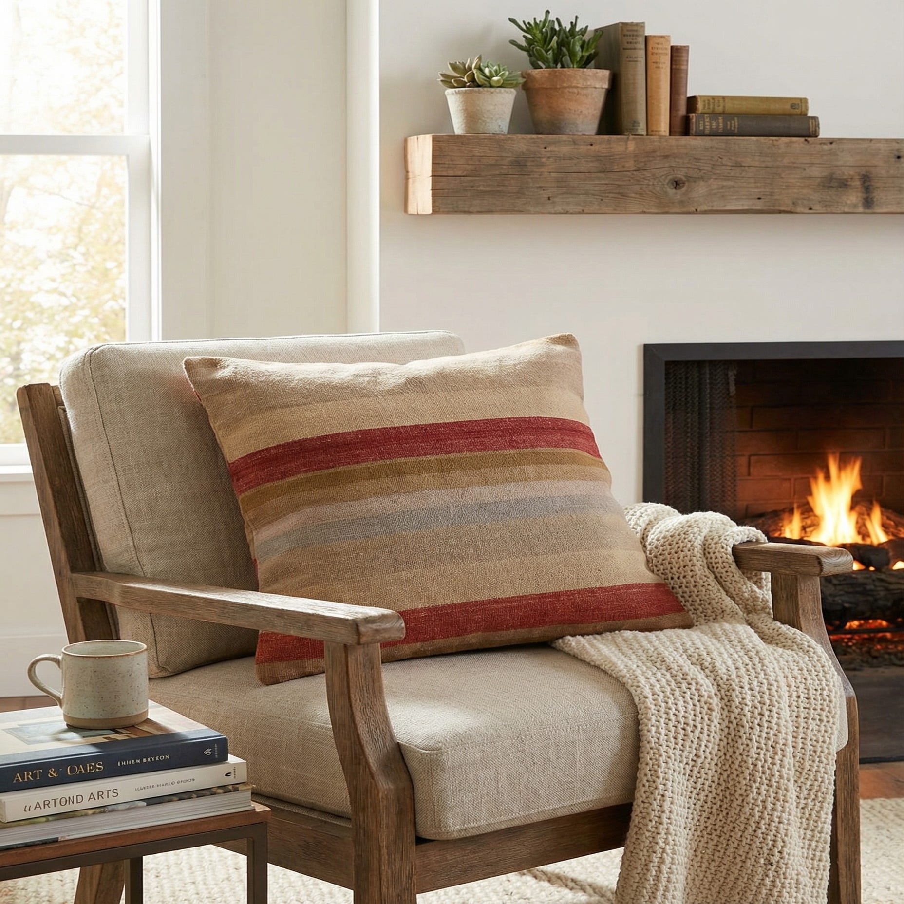 A square, multi-colored wool rug featuring horizontal stripes in shades of red, beige, brown, and light blue.