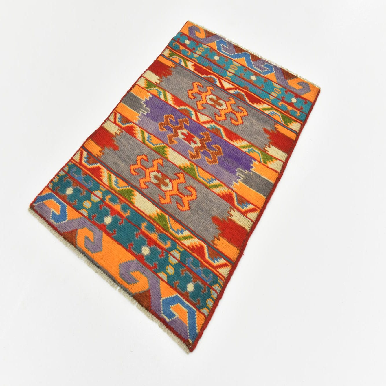 A 3x4 rectangular Balouch rug featuring a vibrant Southwestern tribal pattern with multi-colored stripes and geometric motifs.