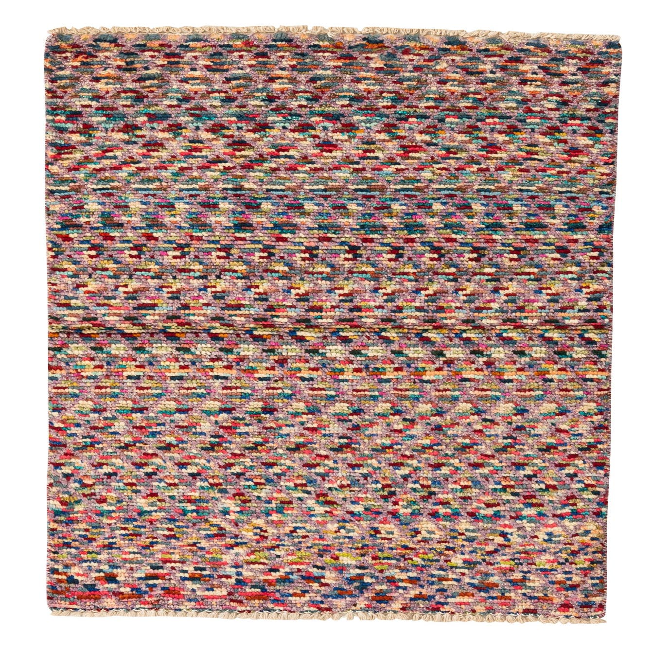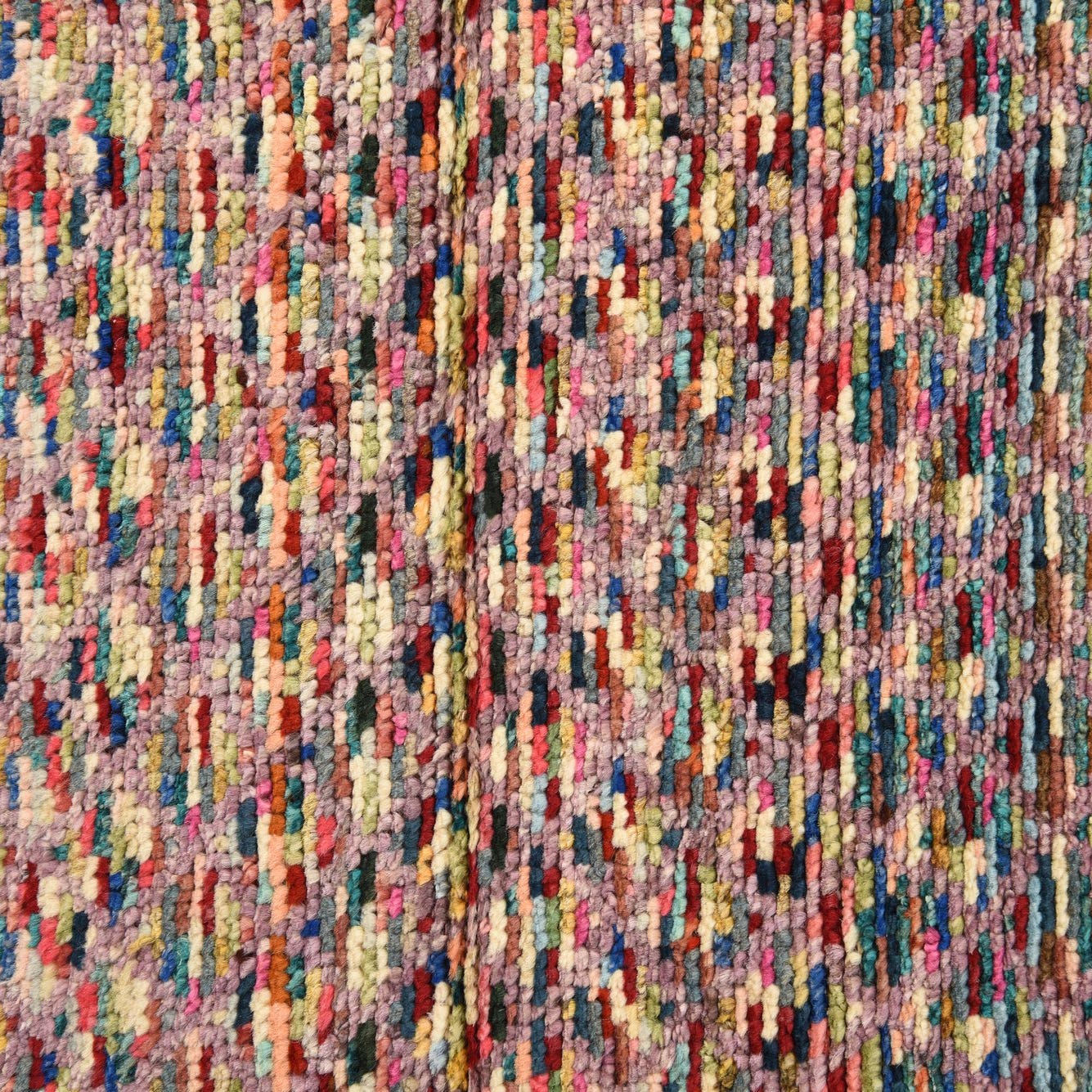 A 3x4 rectangular multi-colored wool rug with a high pile and abstract pattern, ideal for indoor spaces.