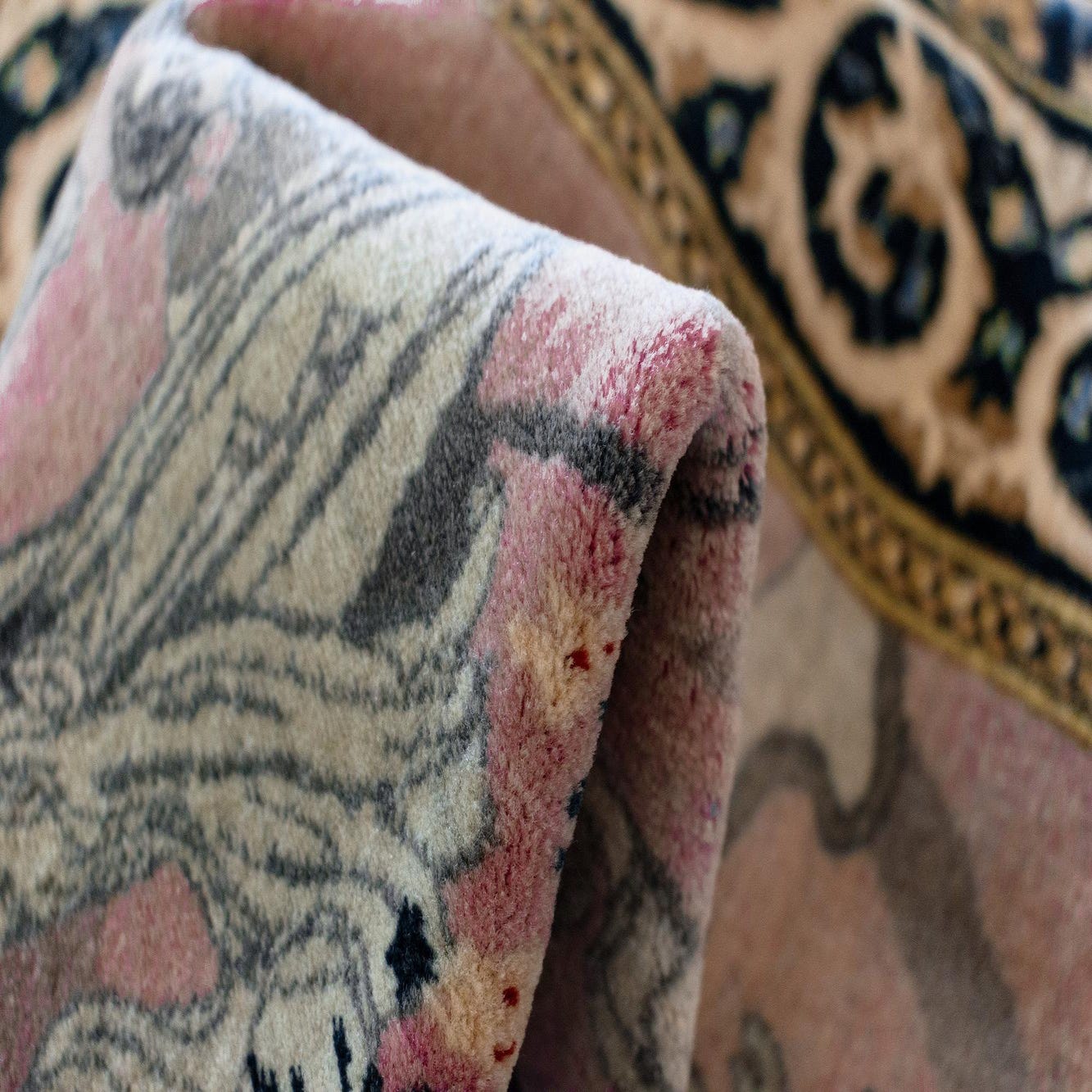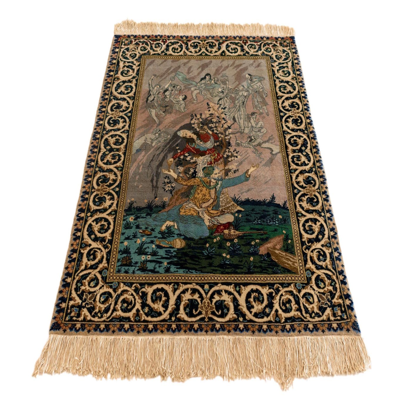 A 3x4 rectangular multi-colored Persian wool rug featuring a detailed mythological scene with figures and a tree, framed by an ornate border.