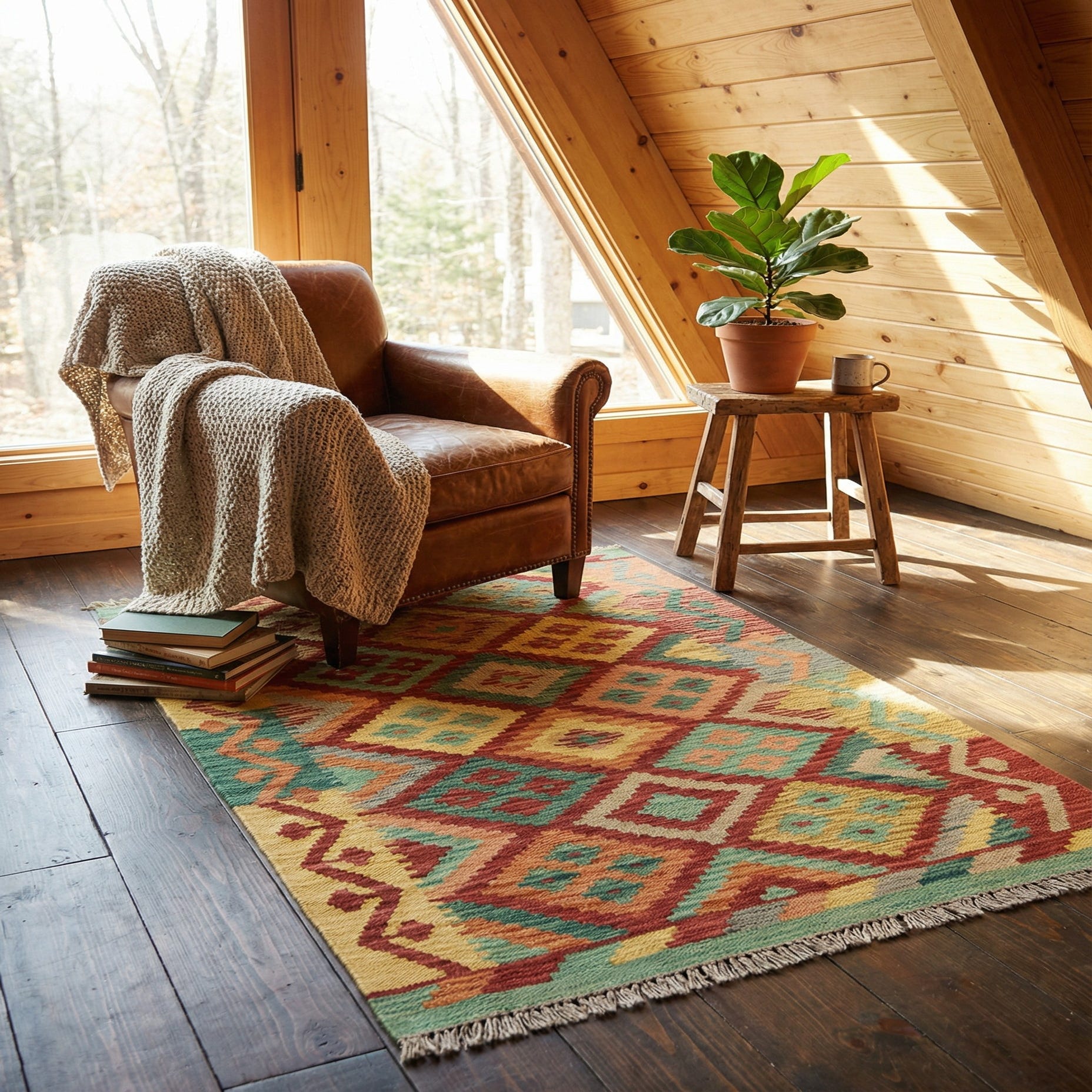 The flat-weave texture offers durability and a low profile, suitable for high-traffic areas and under door clearances. The vibrant color palette and bold patterns make it an ideal choice for adding a touch of warmth and character to modern, bohemian, or eclectic interiors. It can serve as a focal point in a minimalist setting or complement a more layered, maximalist decor scheme. The rug's handcrafted nature ensures that each piece is unique, bearing the hallmark of traditional craftsmanship.