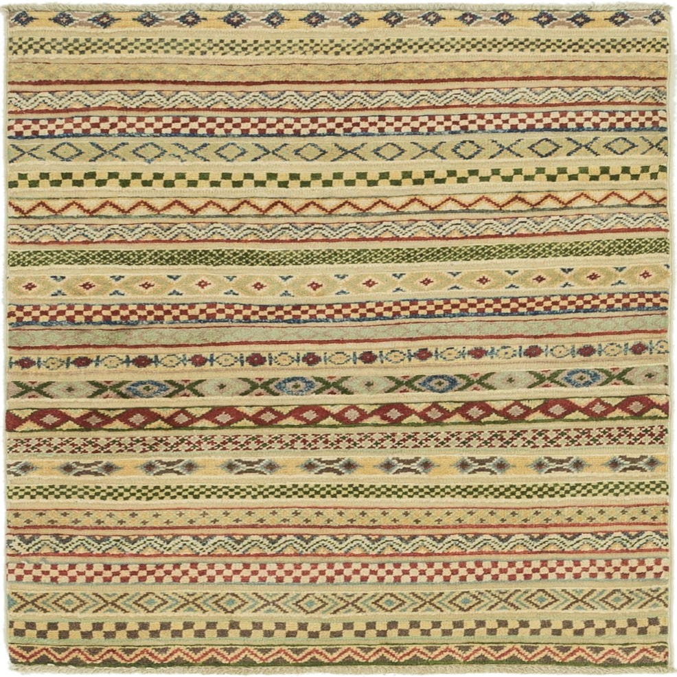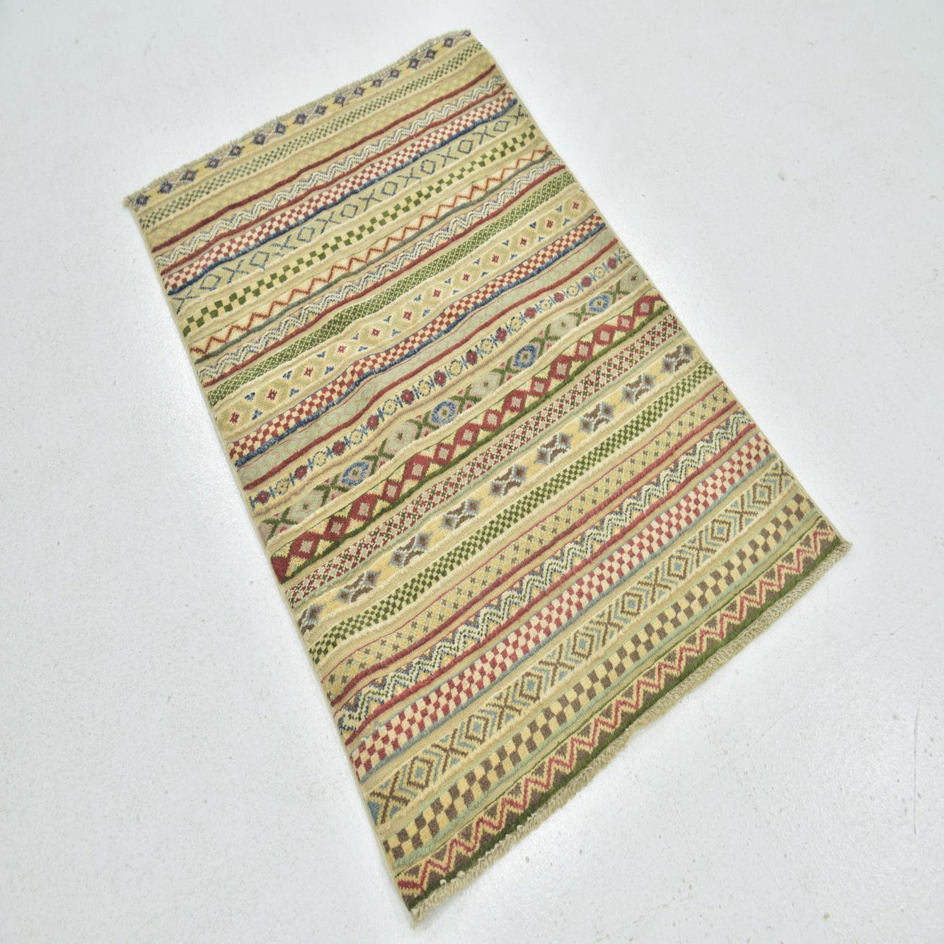 A 3x4 rectangular multi-colored Southwestern rug with horizontal stripes of various tribal patterns and colors, made from hand-spun wool.
