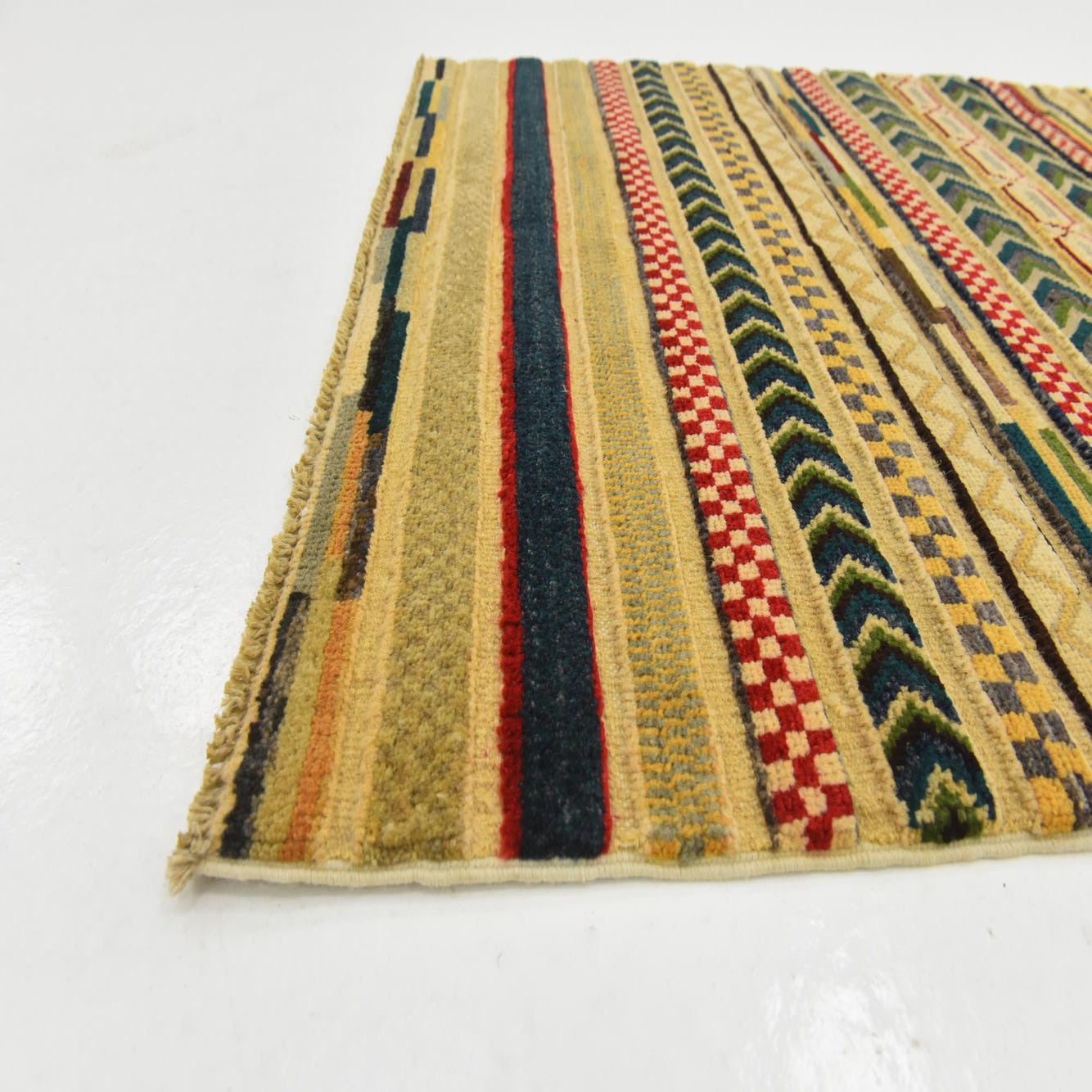 A 3x4 rectangular multi-colored Southwestern rug with horizontal stripes featuring tribal patterns and geometric shapes.