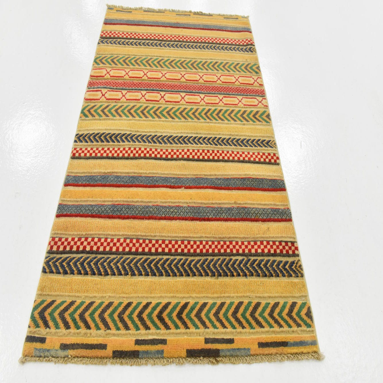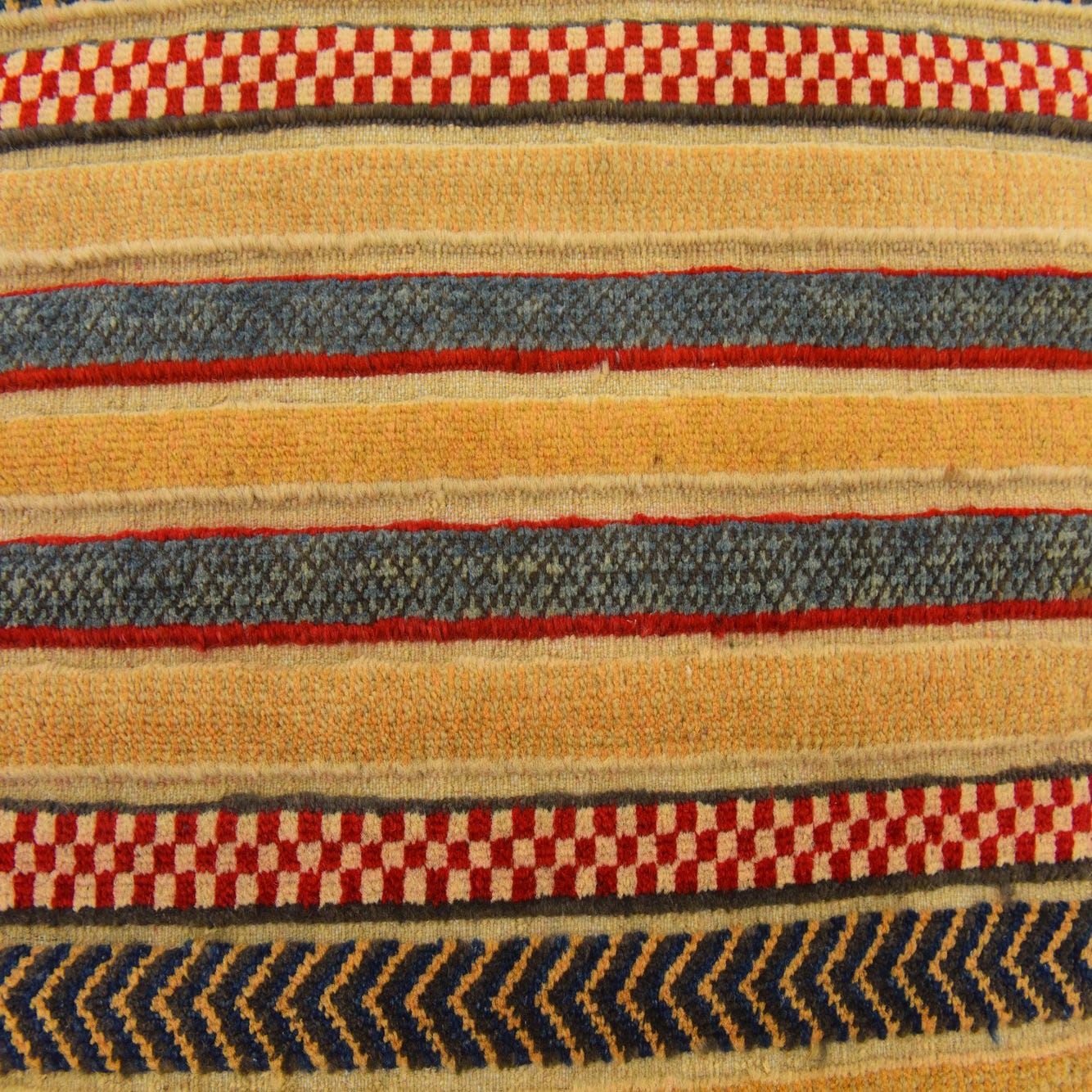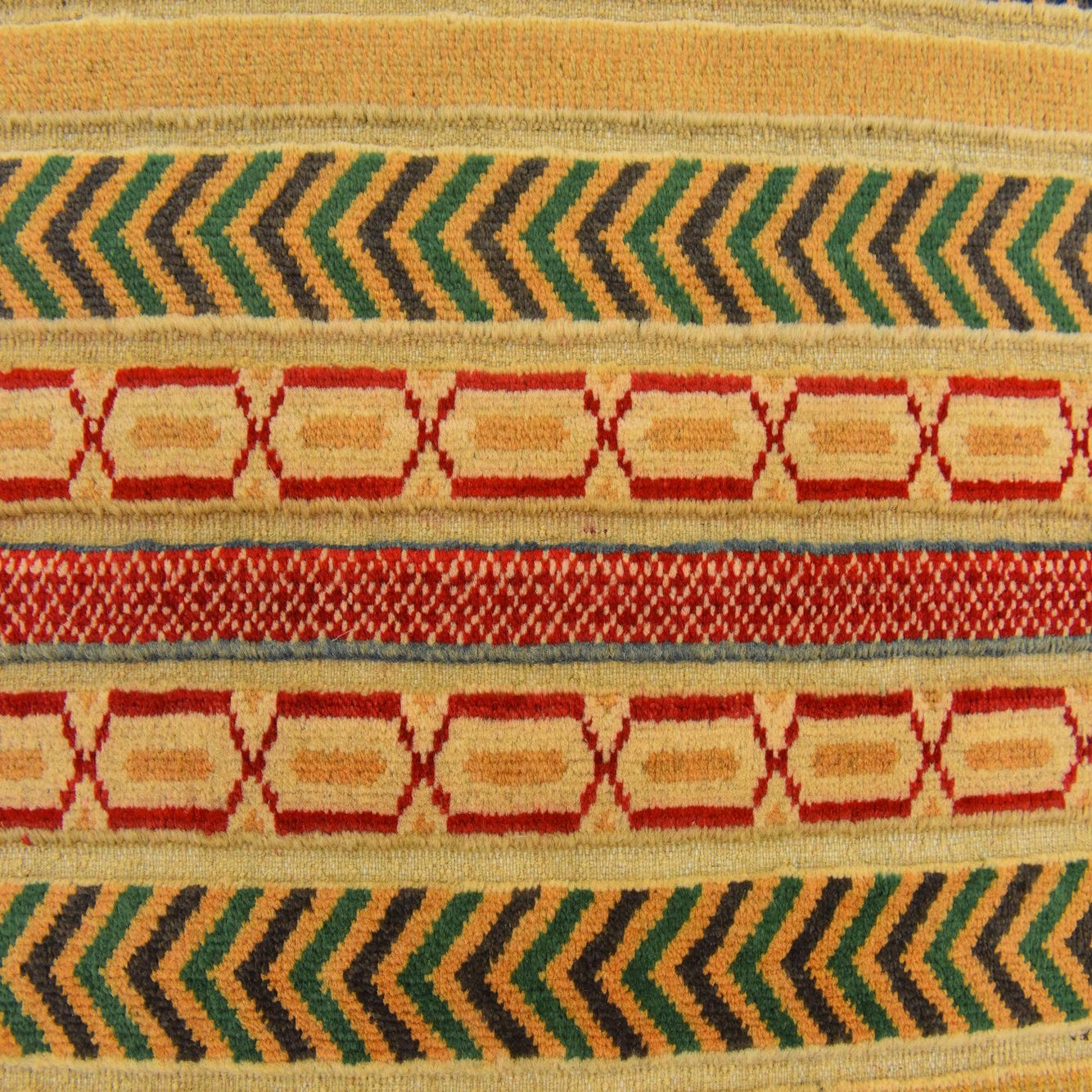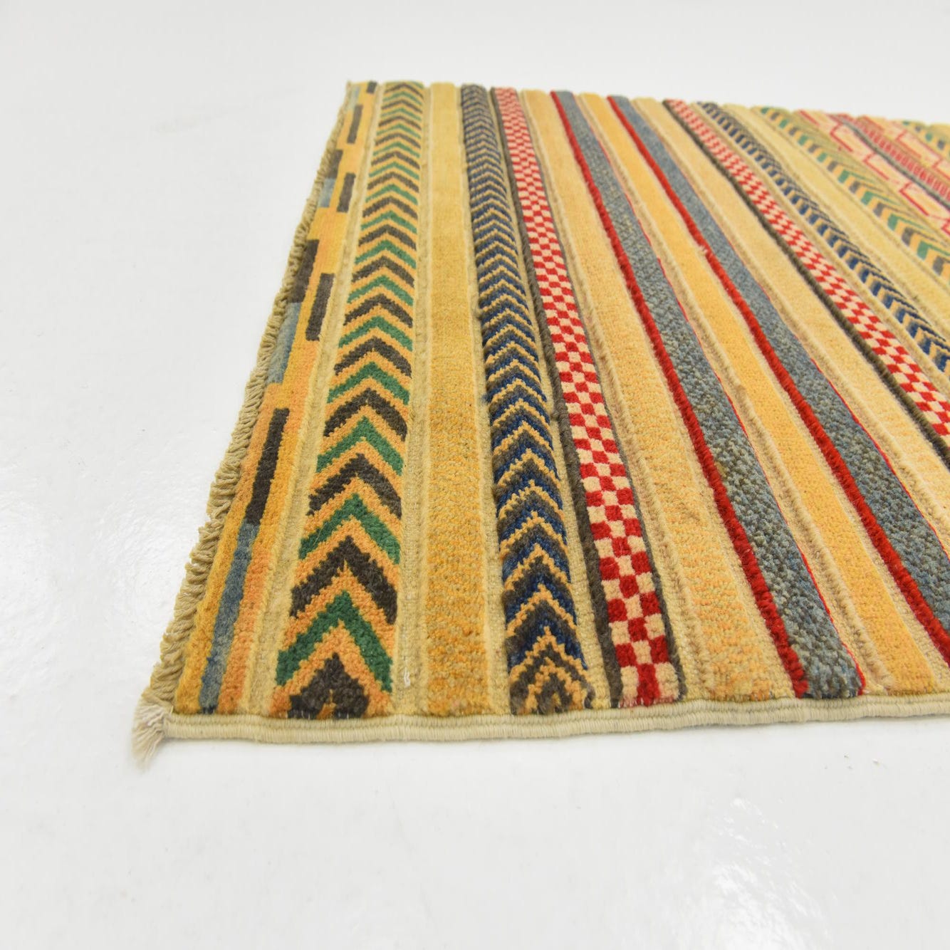 A 3x4 rectangular multi-colored wool rug featuring Southwestern and tribal stripes in yellow, red, blue, and green.