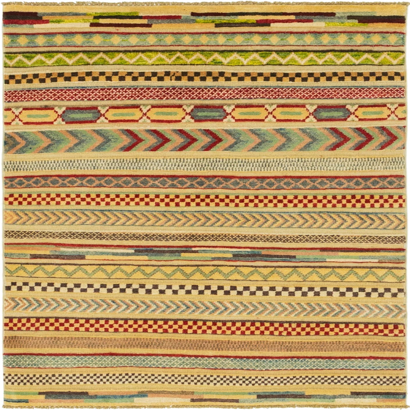 Part of the Modern Ziegler collection, this hand-knotted rug is crafted from 100% hand-spun wool, offering both durability and plush texture. Measuring 3x4, it features a striking, multi-hued background comprised of beige, brown, burgundy, cream, green, light blue, tan, and terracotta, providing a versatile palette that can complement a variety of color schemes. The rug showcases a series of horizontal stripes with varied patterns ranging from geometric to abstract, creating visual interest and depth.