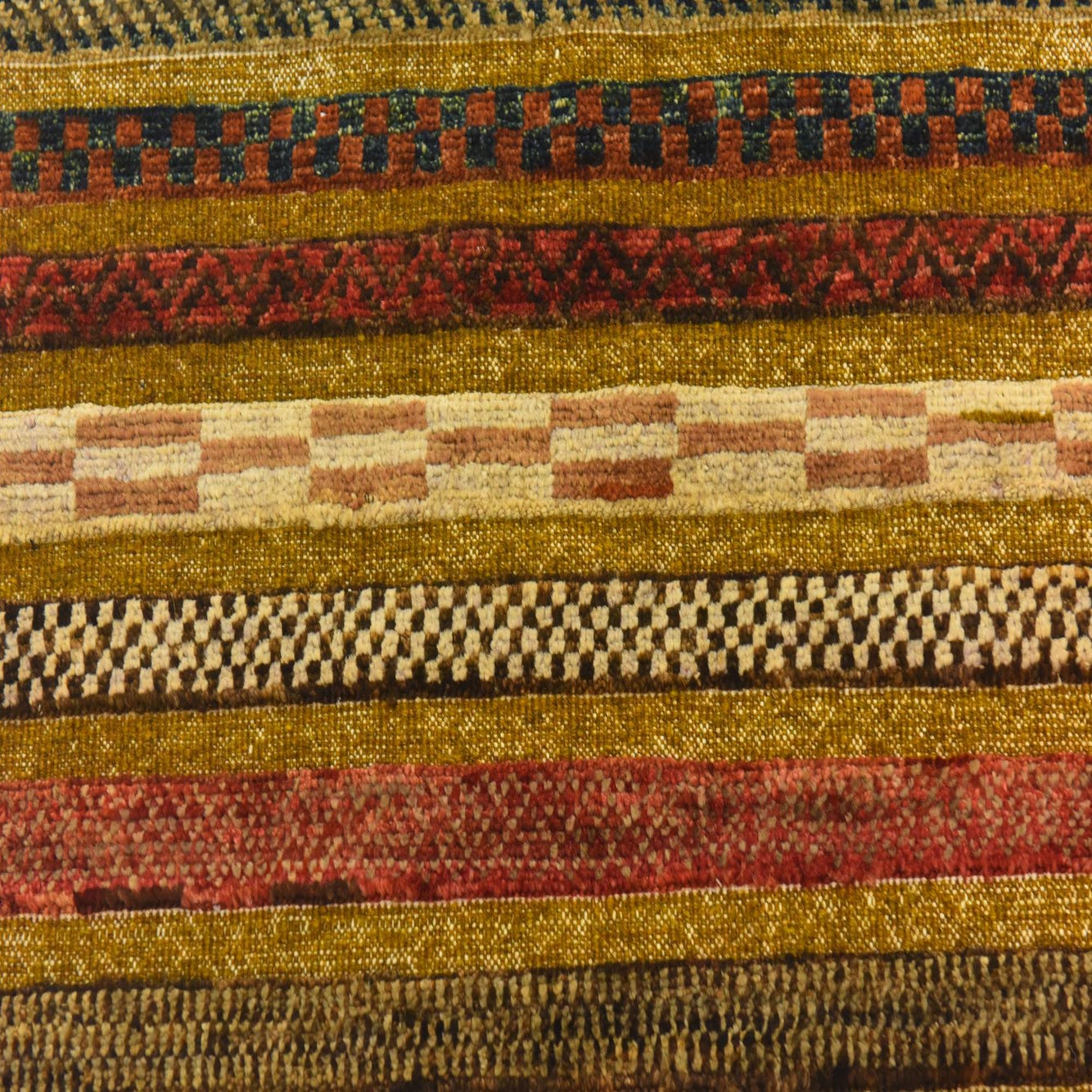 A rectangular 3x4 multi-colored rug with horizontal stripes in various tribal patterns, including chevron, checkerboard, and solid bands.