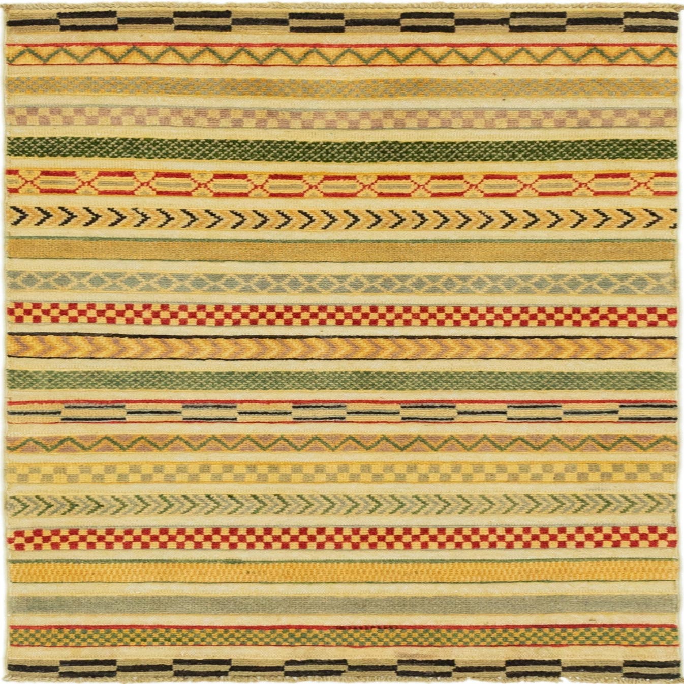 A 3x4 rectangular multi-colored wool rug featuring diverse Southwestern and tribal striped patterns in red, green, yellow, and black.