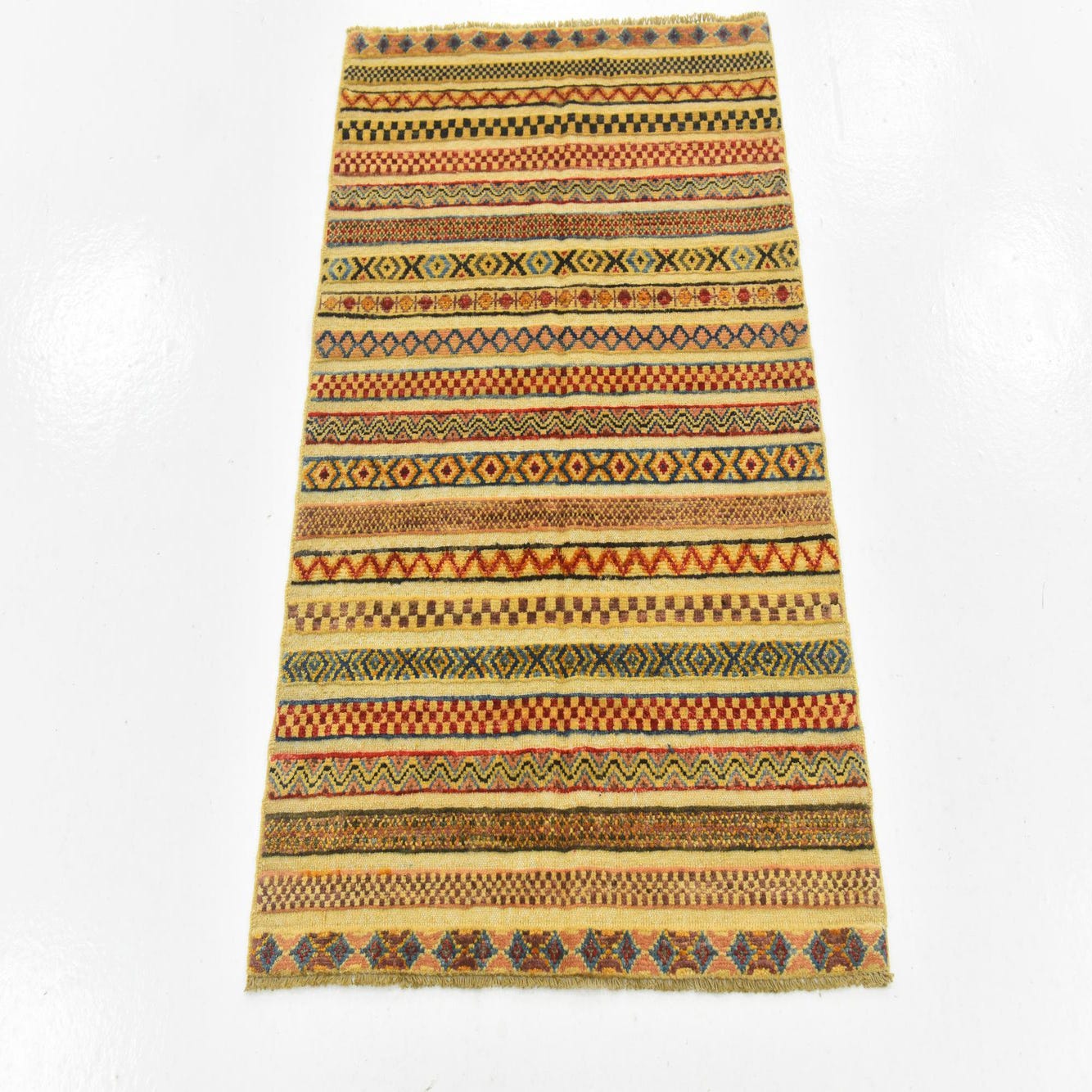 The rug's design boasts a striped pattern that alternates between geometrically stylized motifs and a variety of textures. Each stripe is distinct, making use of color and pattern to create a tapestry of traditional elements with a contemporary twist. The presence of fringe on either end adds a classic touch to this handcrafted piece.