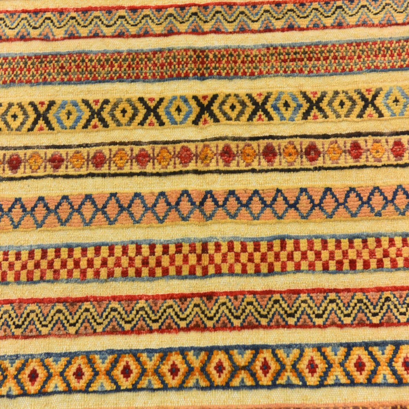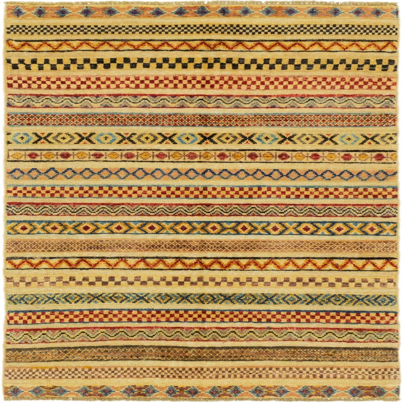 A 3x4 rectangular multi-colored Southwestern tribal rug with horizontal stripes of various geometric patterns.