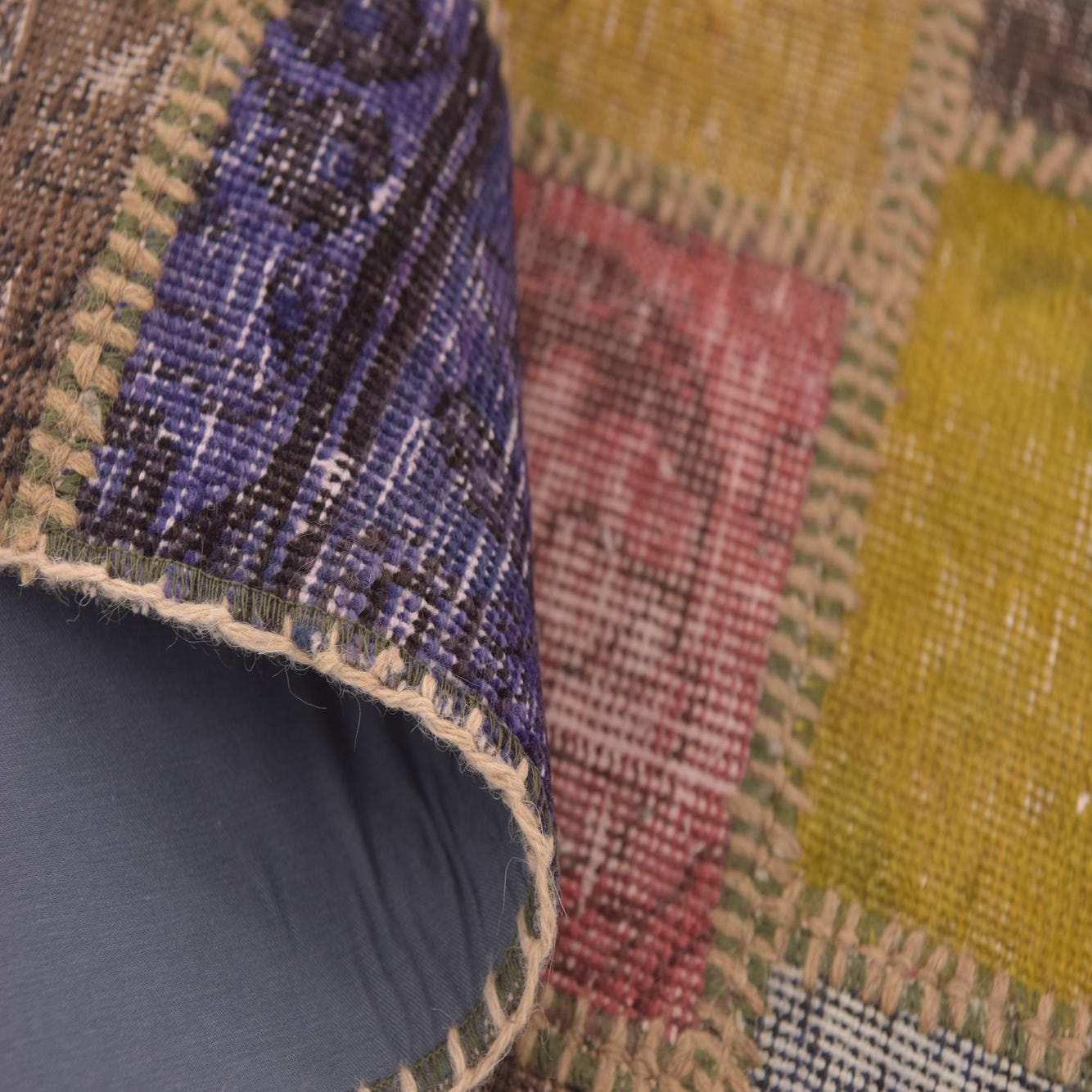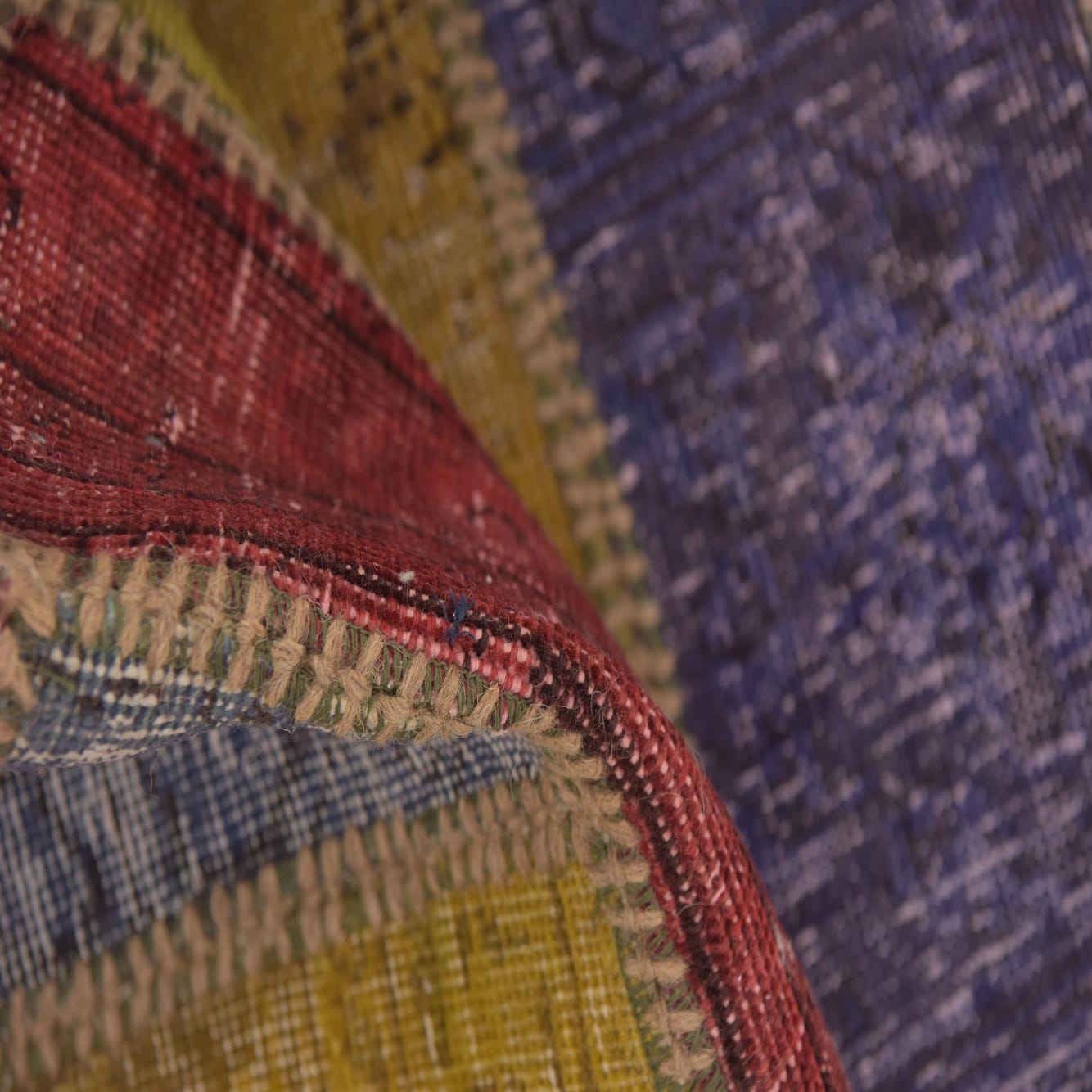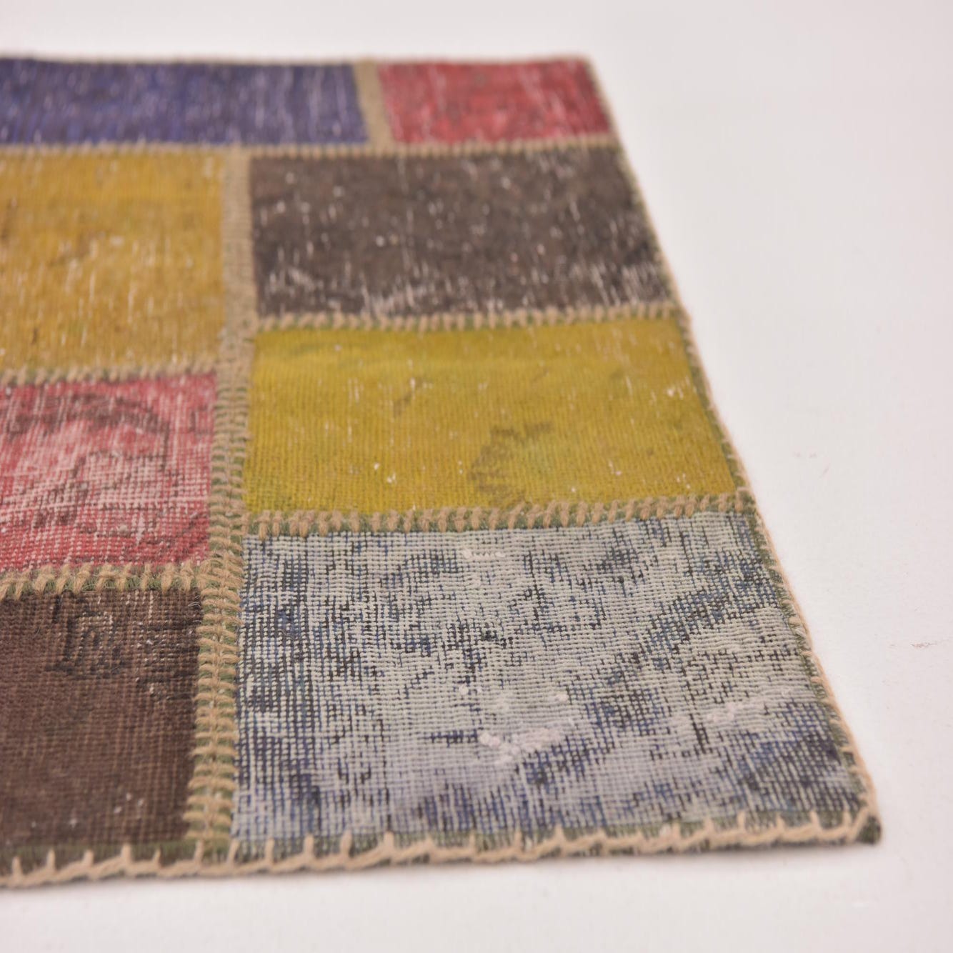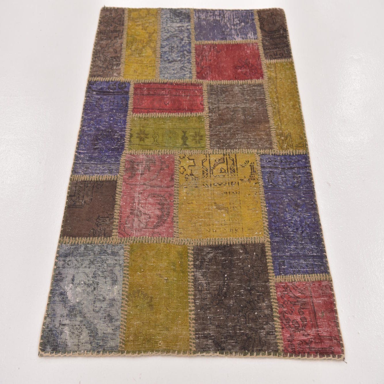 A 3x4 rectangular multi-colored patchwork rug made from vintage wool, featuring various distressed Persian and Southwestern patterns.
