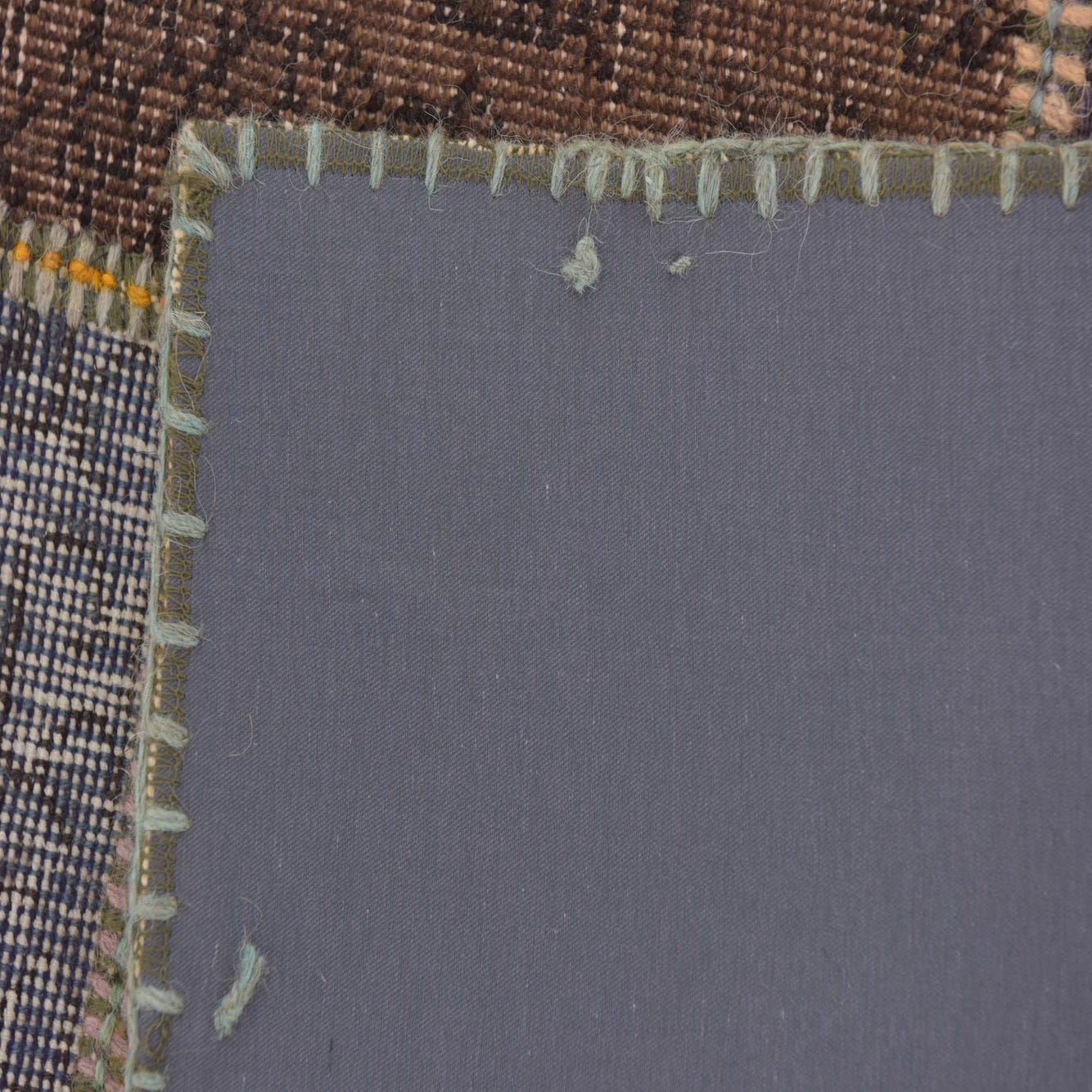 A 3x4 rectangular multi-colored patchwork rug made of vintage wool fabric squares in various shades of red, blue, green, yellow, and brown, with visible stitching.