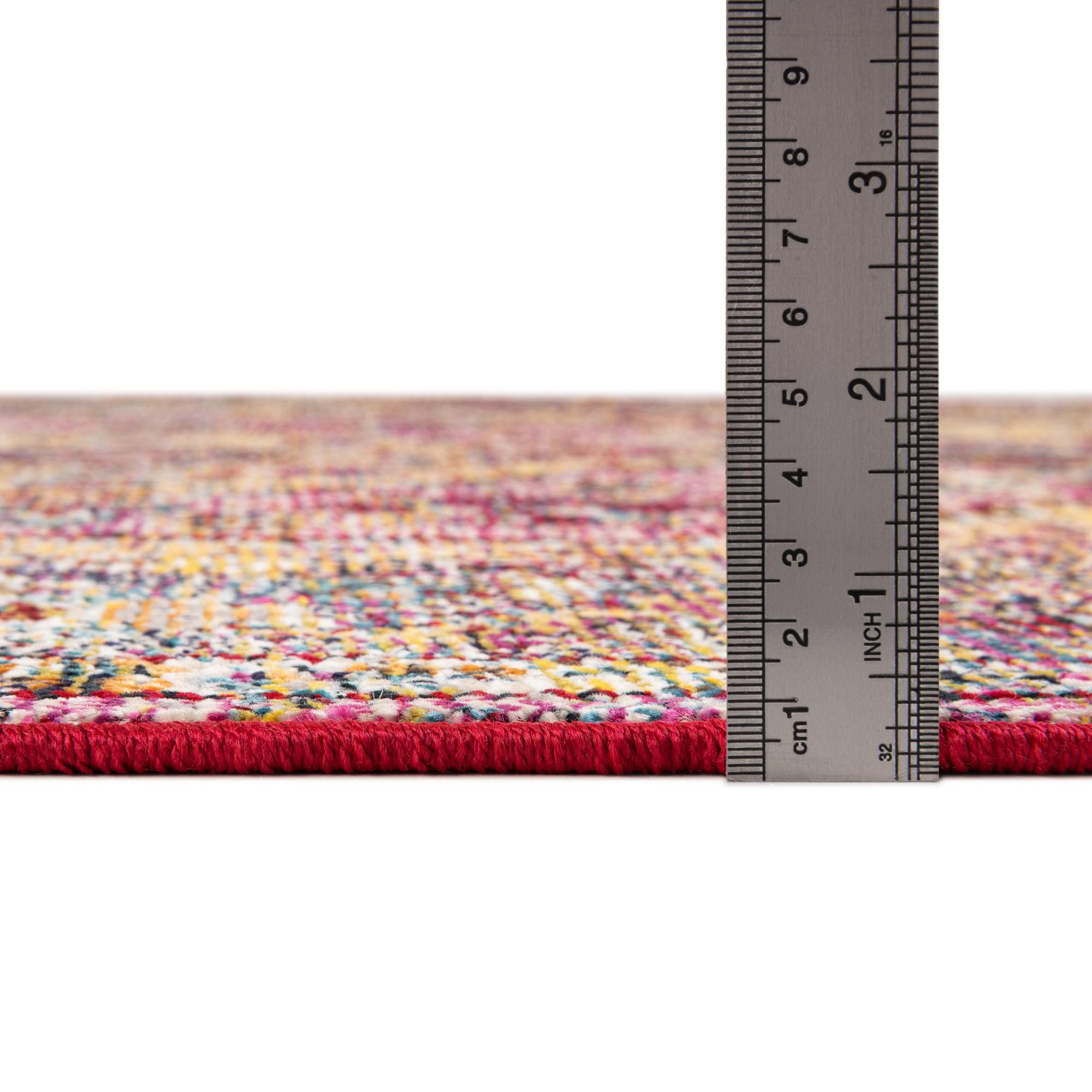 Primary color is Multi. Colors in this rug include: Multi, Blue, Gold, Gray, Light Blue, Purple, Rust Red.