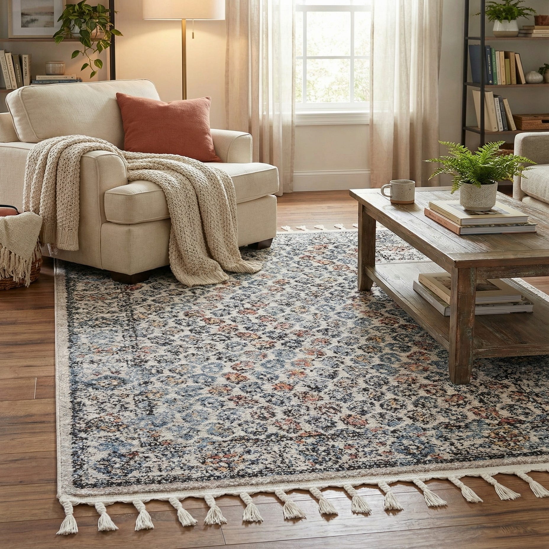 A softly distressed, allover medallion pattern gives this machine-made polypropylene rug a lived-in, vintage-inspired look. The multi-colored background blends ivory and gray with washes of light blue and deeper blue, punctuated by rust red, orange and black accents that add visual interest without overwhelming the design. The pile feels low and dense underfoot, with a slightly cushioned texture that reads both casual and refined. Finished ends with short tassel fringe bring a relaxed, handcrafted touch to the overall aesthetic.