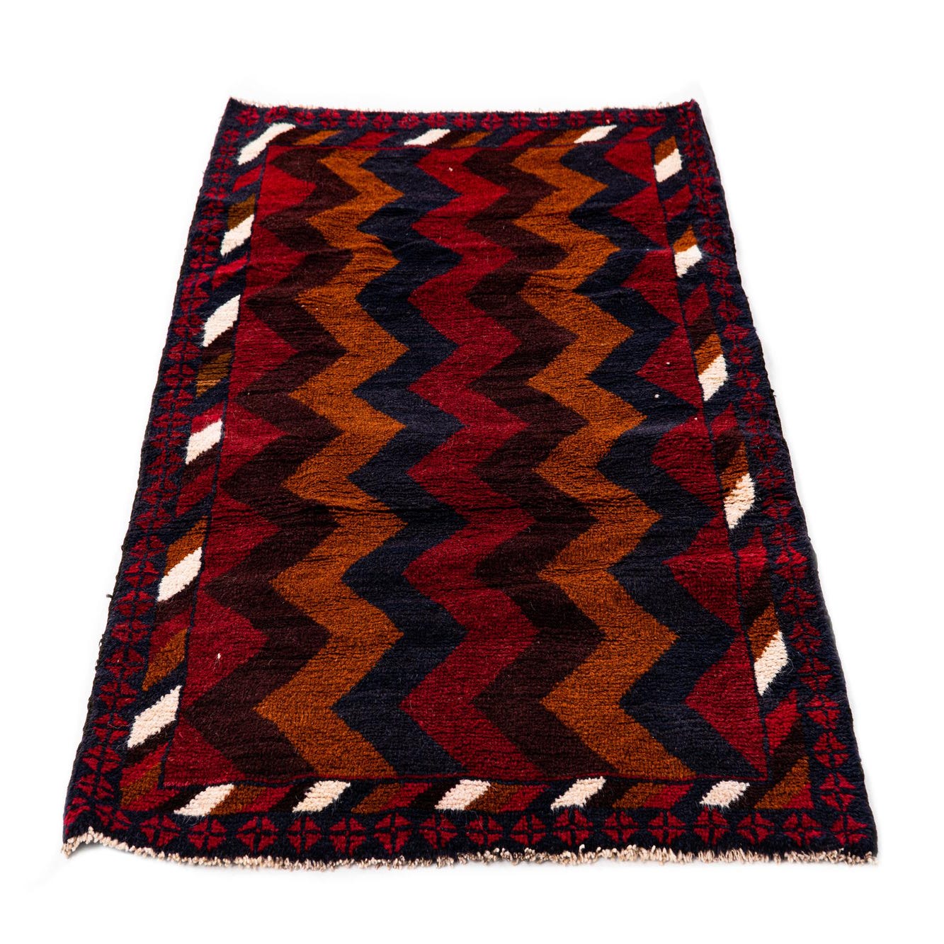 A 3x5 rectangular Balouch rug featuring a bold multi-colored zigzag pattern in red, navy, and brown, with a tribal border.
