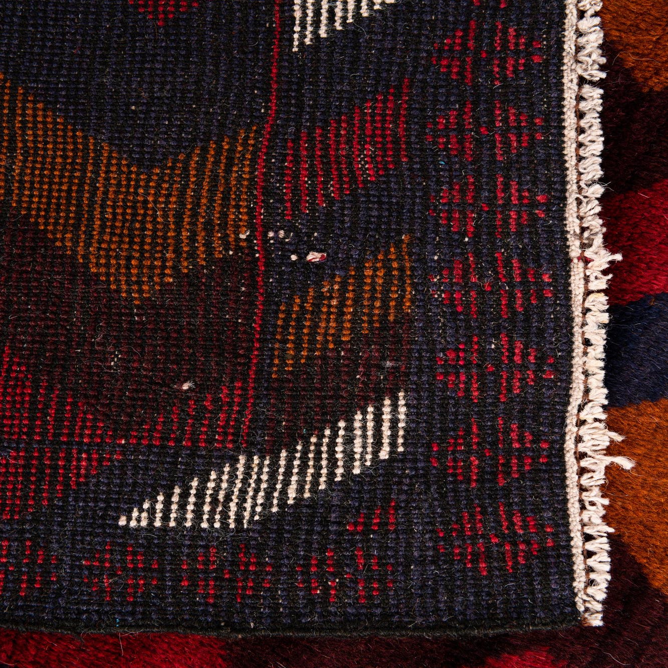 Hand-knotted of 100% wool, the rug has a dense, tactile pile and visible knot structure that gives the surface a slightly plush but sturdy feel. The warm, saturated colors and strong linear rhythm make this piece well suited to an entryway or study, as a grounding layer in a living room with leather and wood furnishings, or to add depth to a modern or eclectic bedroom. Pair it with neutral upholstery and metal accents for a balanced contrast, or mix it into a layered, bohemian palette alongside textured throws and woven baskets.