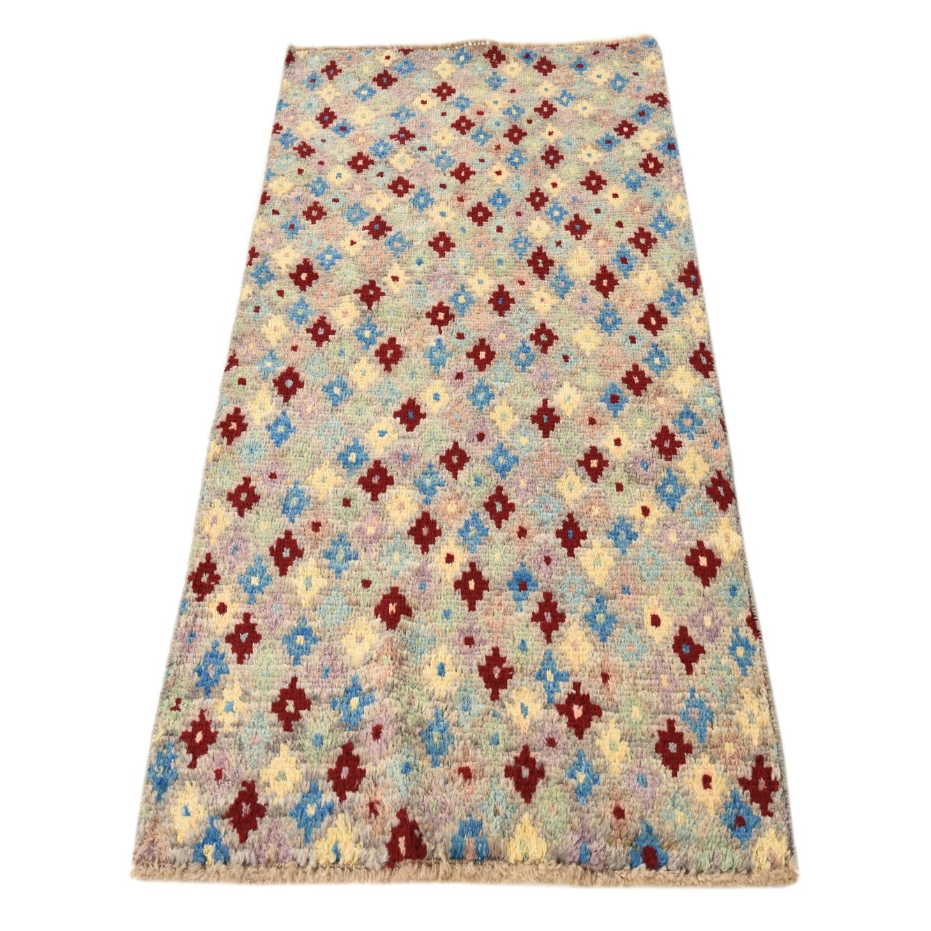 The Balouch collection 3x5 rug is a distinctive hand-knotted piece crafted from 100% wool, offering a durable and textured surface. Its rich multi-color background sets the stage for an array of geometric patterns, featuring shades of blue, burgundy, gray, green, light blue, yellow, and purple. The intricate design exhibits a sense of traditional charm with a contemporary color palette, making this rug an adaptable choice for a variety of decor styles.
