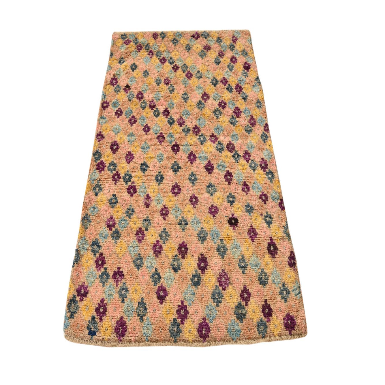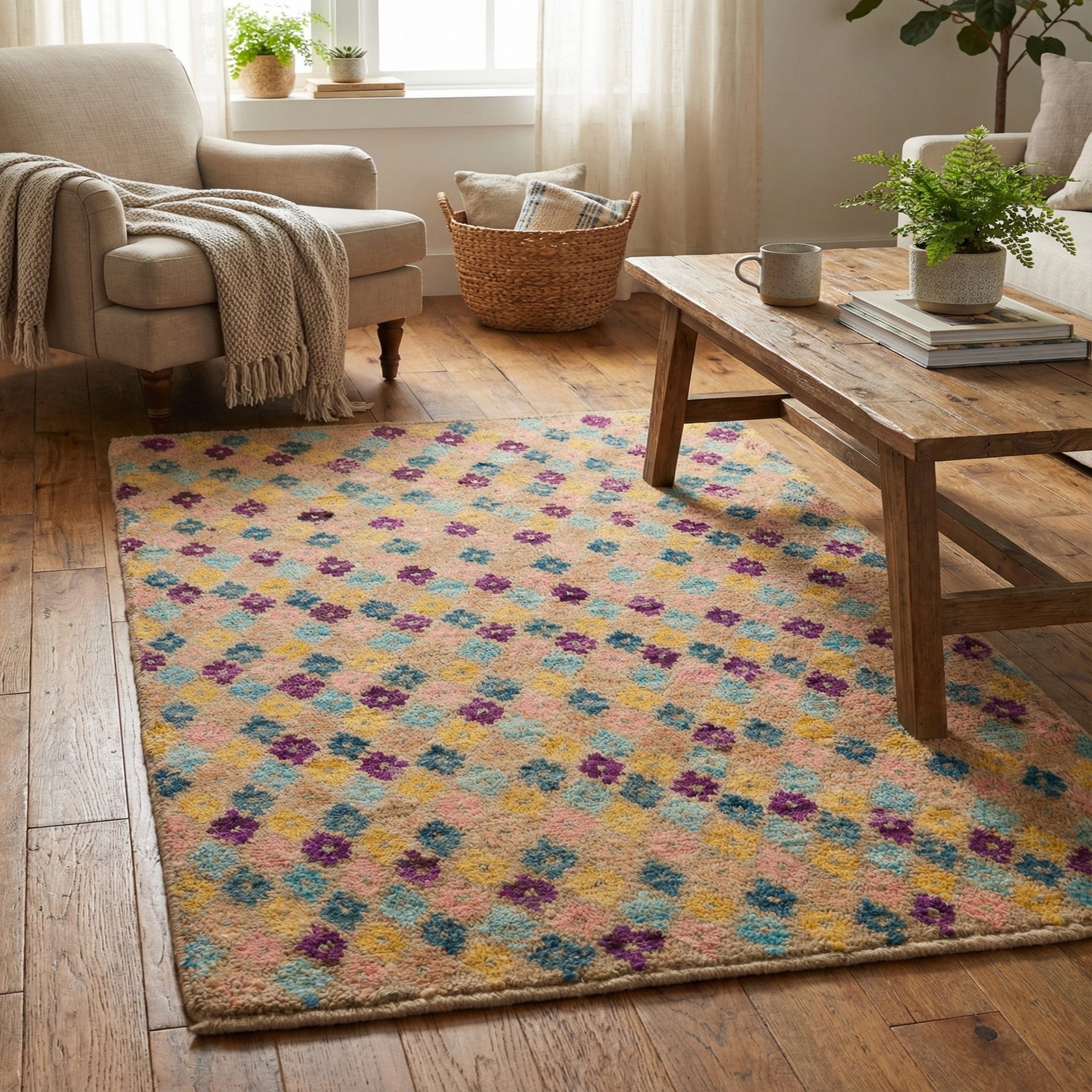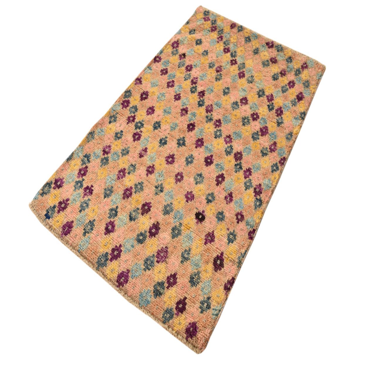A lively allover pattern of small, diamond-like floral motifs scatters across a multi background, creating a casual, handwoven character that works with both traditional and contemporary rooms. Colorful pops of yellow, turquoise, teal, pink, violet and navy blue sit against the multi base, with touches of beige softening the palette. Hand-knotted from 100% wool, the pile has a pleasantly dense, slightly springy feel underfoot and a natural, tactile texture that reads as comfortably lived-in rather than stiff.