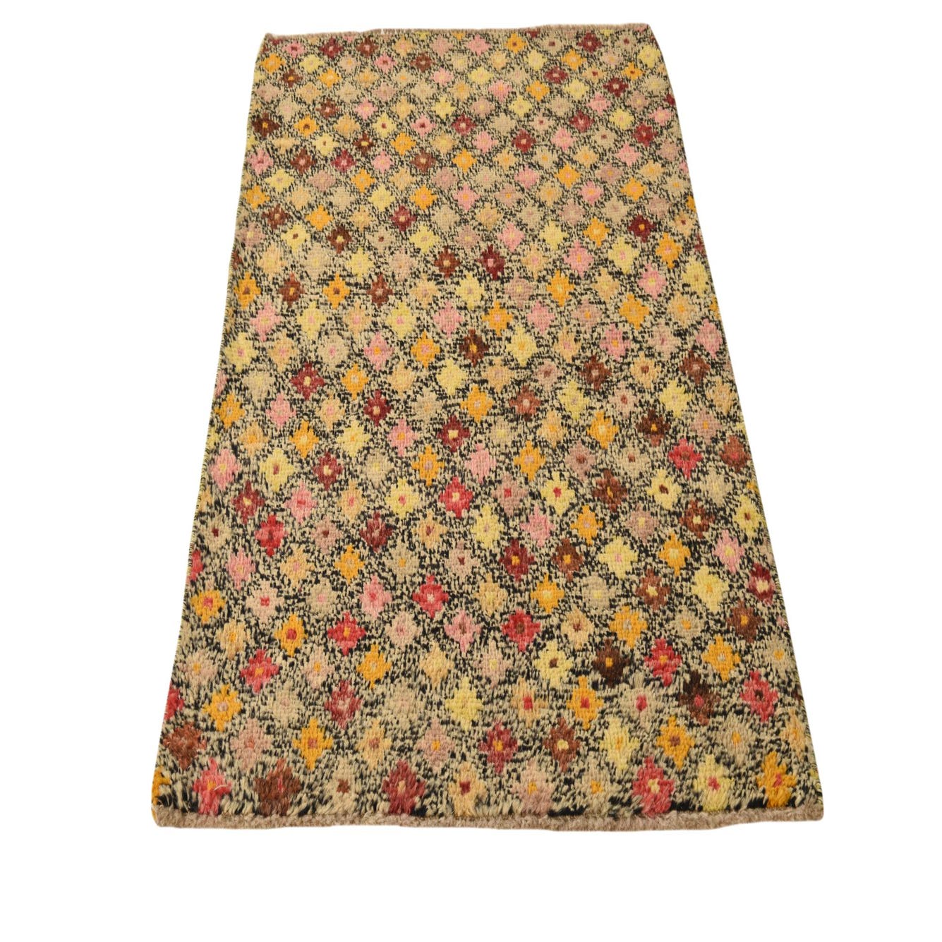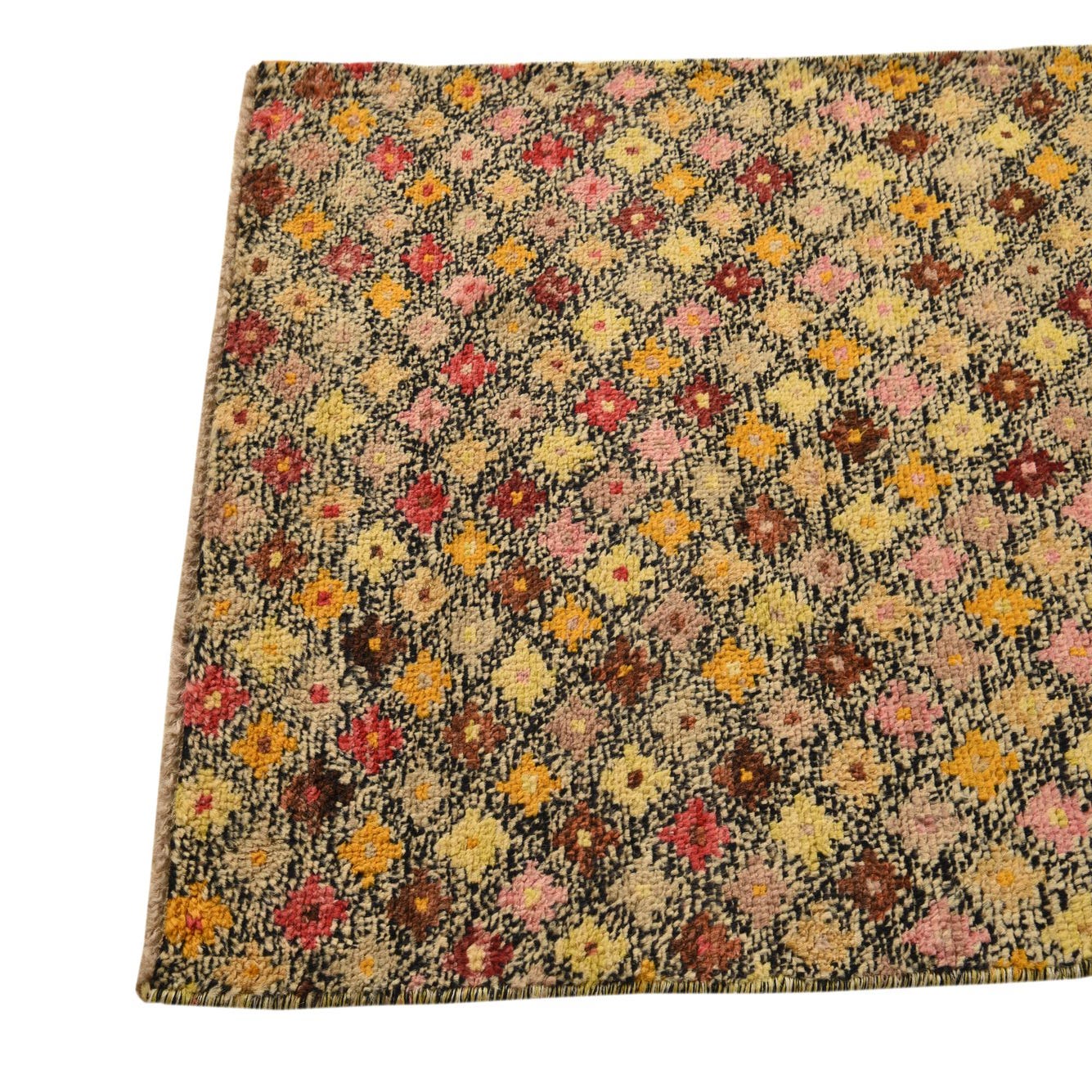 Hand-knotted from 100% wool, this rug presents a dense, tactile pile with the gentle irregularities that come from skilled hand-knotting. A compact field of small geometric floral medallions forms a repeating grid across a multi-tonal background, where black flecking adds depth and contrast. Warm neutrals—beige, tan, ivory and light brown—are punctuated by lively accents of burgundy, pink, mustard gold, blue, green and gray, creating a layered, worn-in appearance that invites touch.