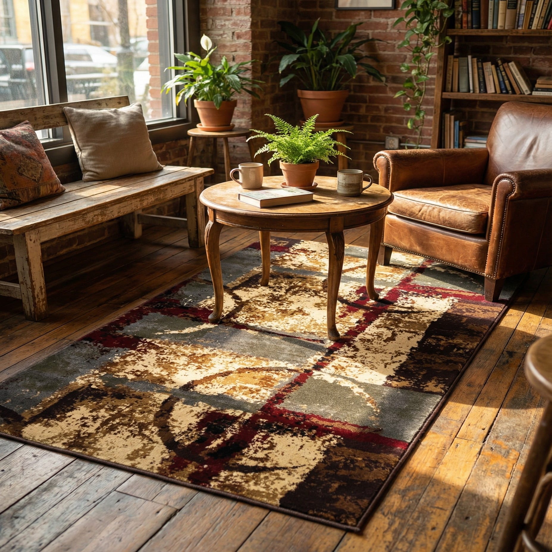 An abstract, painterly design balances geometric structure with distressed texture—layered rectangles and soft, sweeping arcs are intersected by bold burgundy lines that give the rug a graphic focal point. The multi background blends beige, gray, olive, brown, blue and black accents to create depth and movement across the surface. The overall style sits between contemporary and transitional, offering a modern expression that still pairs well with classic furnishings.