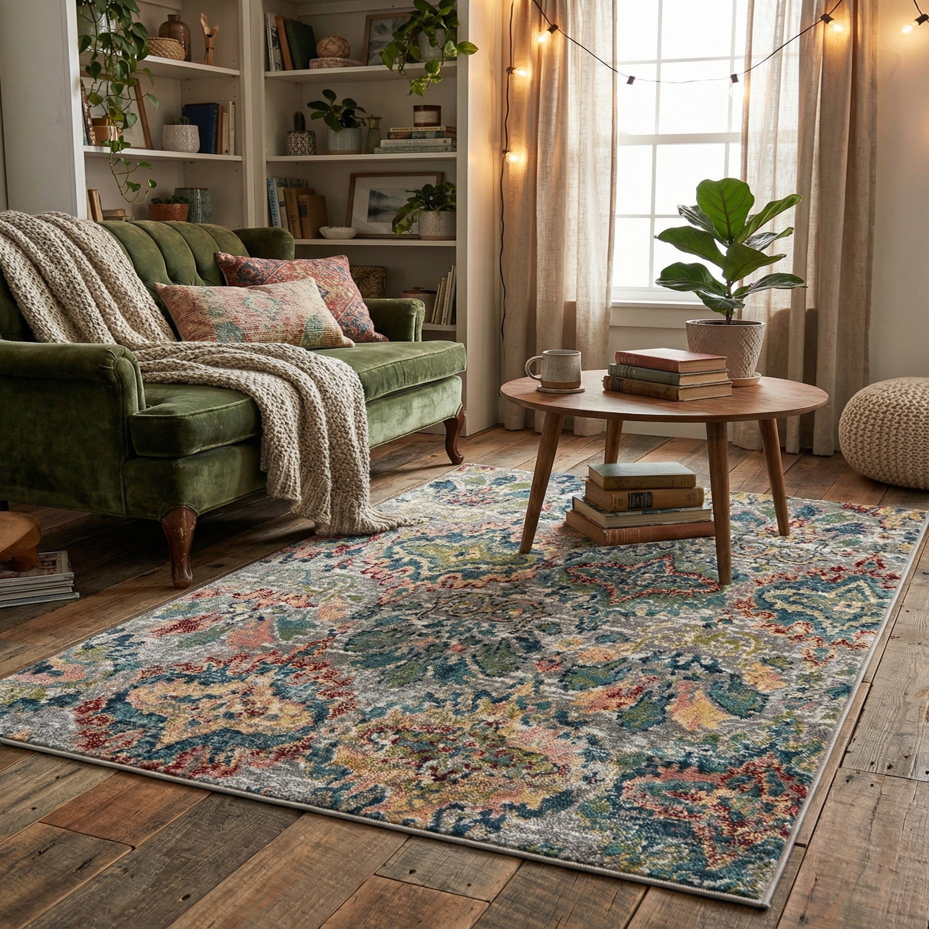 Primary color is Multi. Colors in this rug include: Multi, Blue, Burgundy, Gray, Green, Navy Blue, Pink.