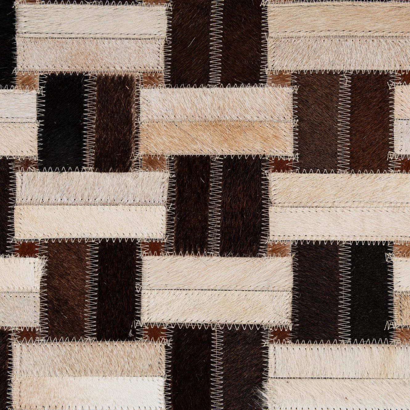 A 3x5 rectangular Cowhide rug featuring a modern patchwork design in varying shades of brown, black, and cream.