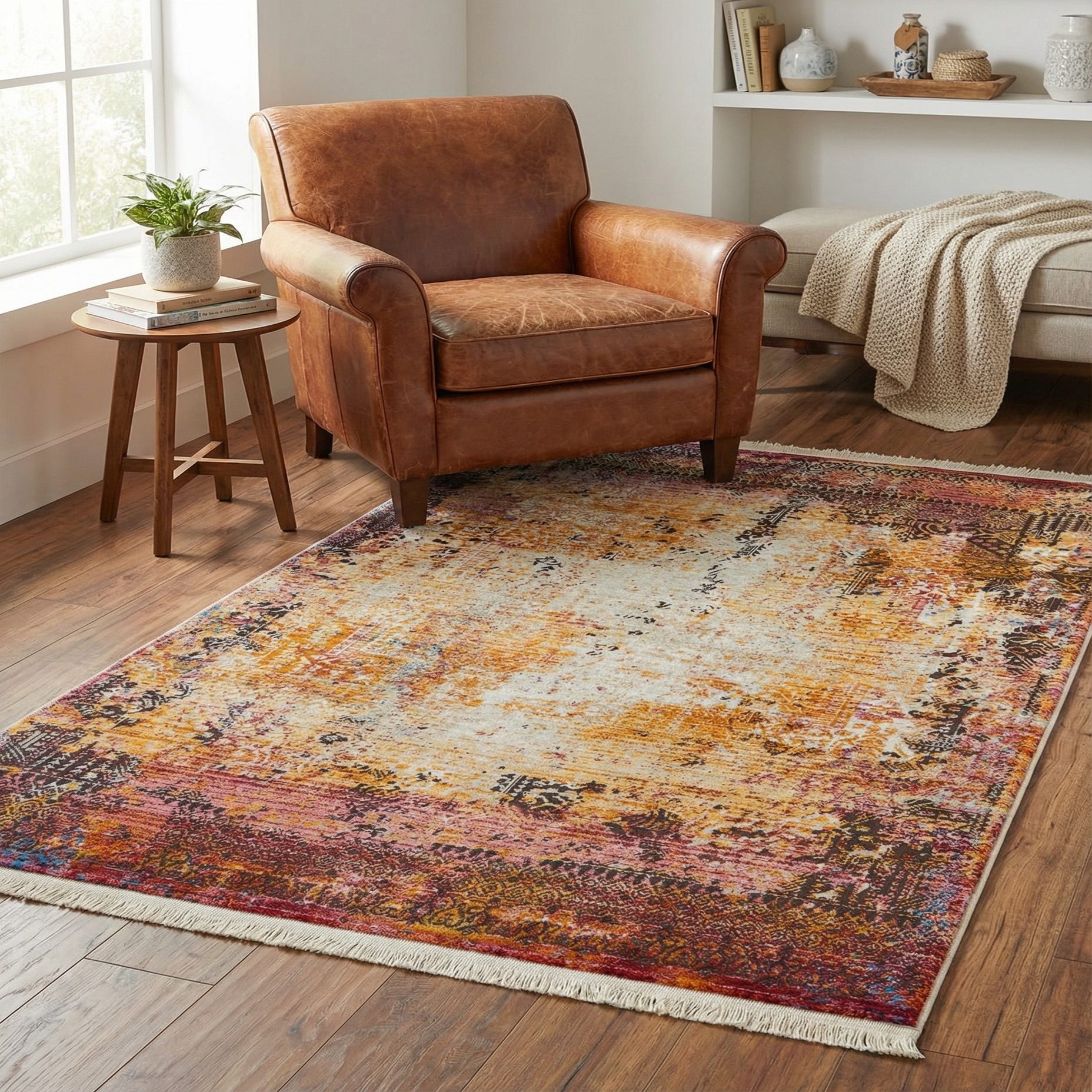 This rug works well as a color anchor in living rooms or family rooms where warm golds and pinks can complement neutral sofas and navy accent pillows. It also fits eclectic or bohemian schemes layered with textured throws and woven baskets, or adds contrast in modern interiors by bringing in patterned warmth without heavy pile. Place it in an entryway, at the foot of a bed, or beneath a small dining table to introduce color and pattern while maintaining a streamlined, easy-care surface.