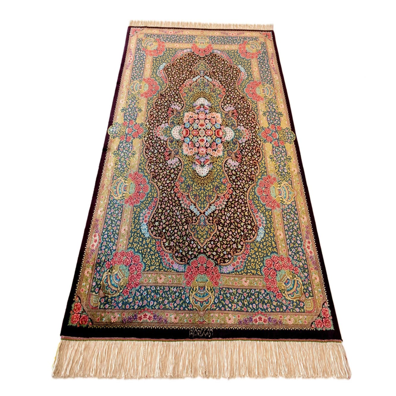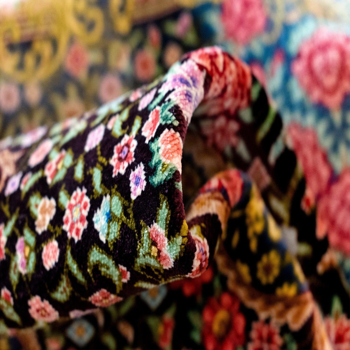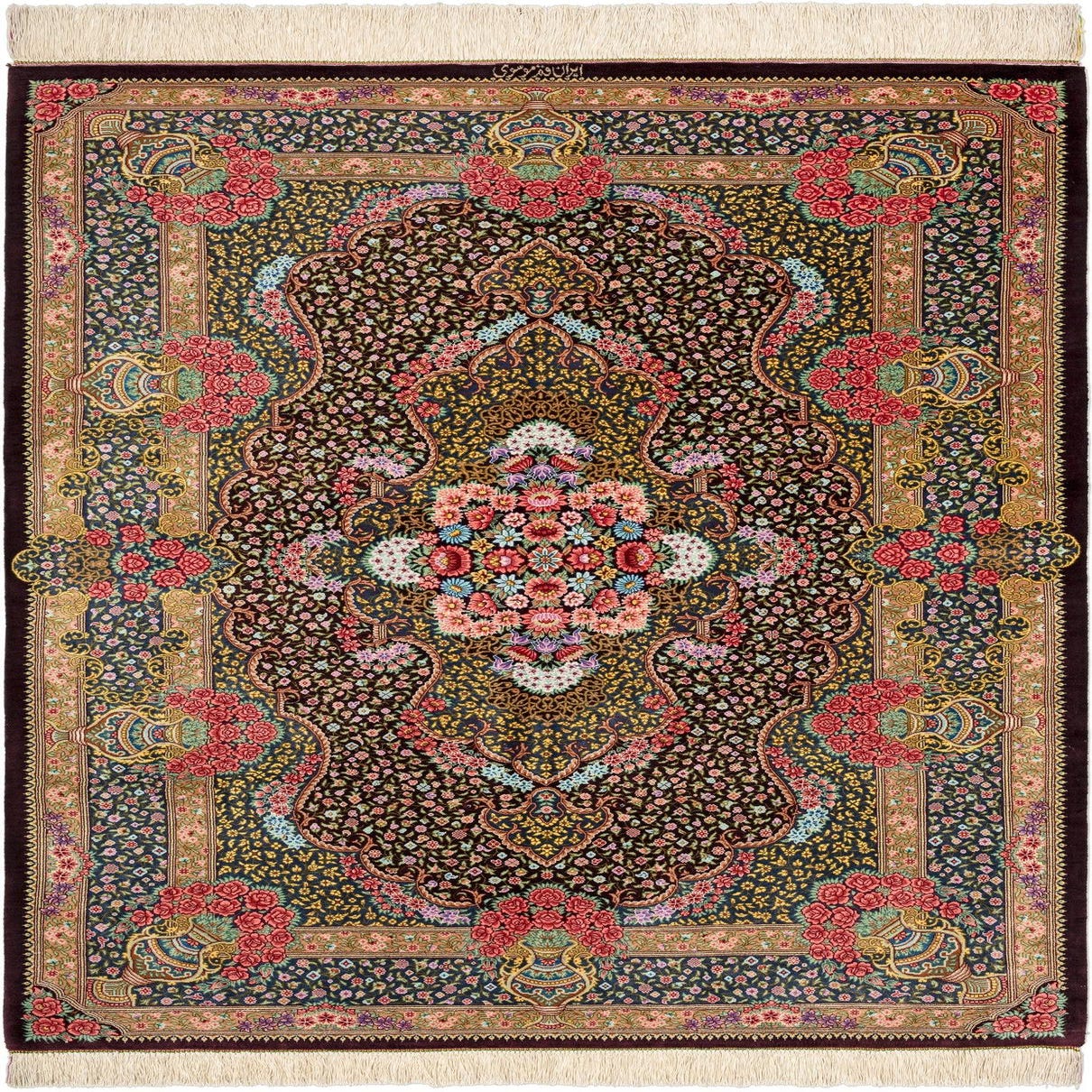 A 3x5 rectangular Ghom Silk Persian rug with a multi-colored floral medallion on a dark background, featuring intricate patterns and fringed ends.