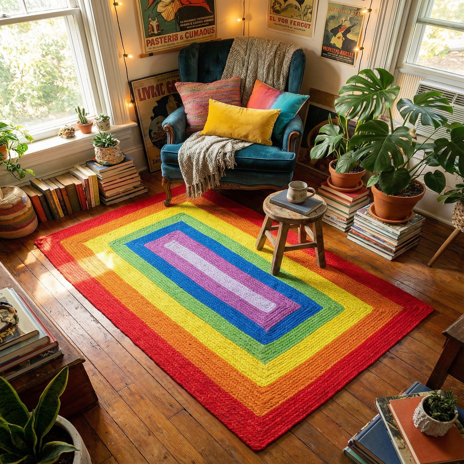 A vibrant 3x5 rectangular braided wool rug featuring a multi-colored rainbow pattern of concentric rectangles, perfect for an entryway.