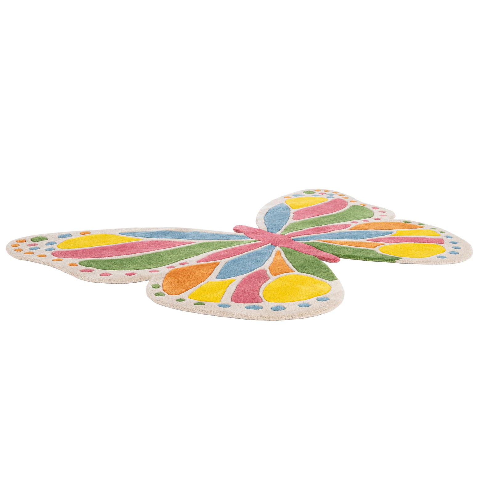 A vibrant, multi-colored butterfly-shaped rug with a pink body and wings featuring blue, green, yellow, orange, and pink segments, outlined in beige with small colorful dots.