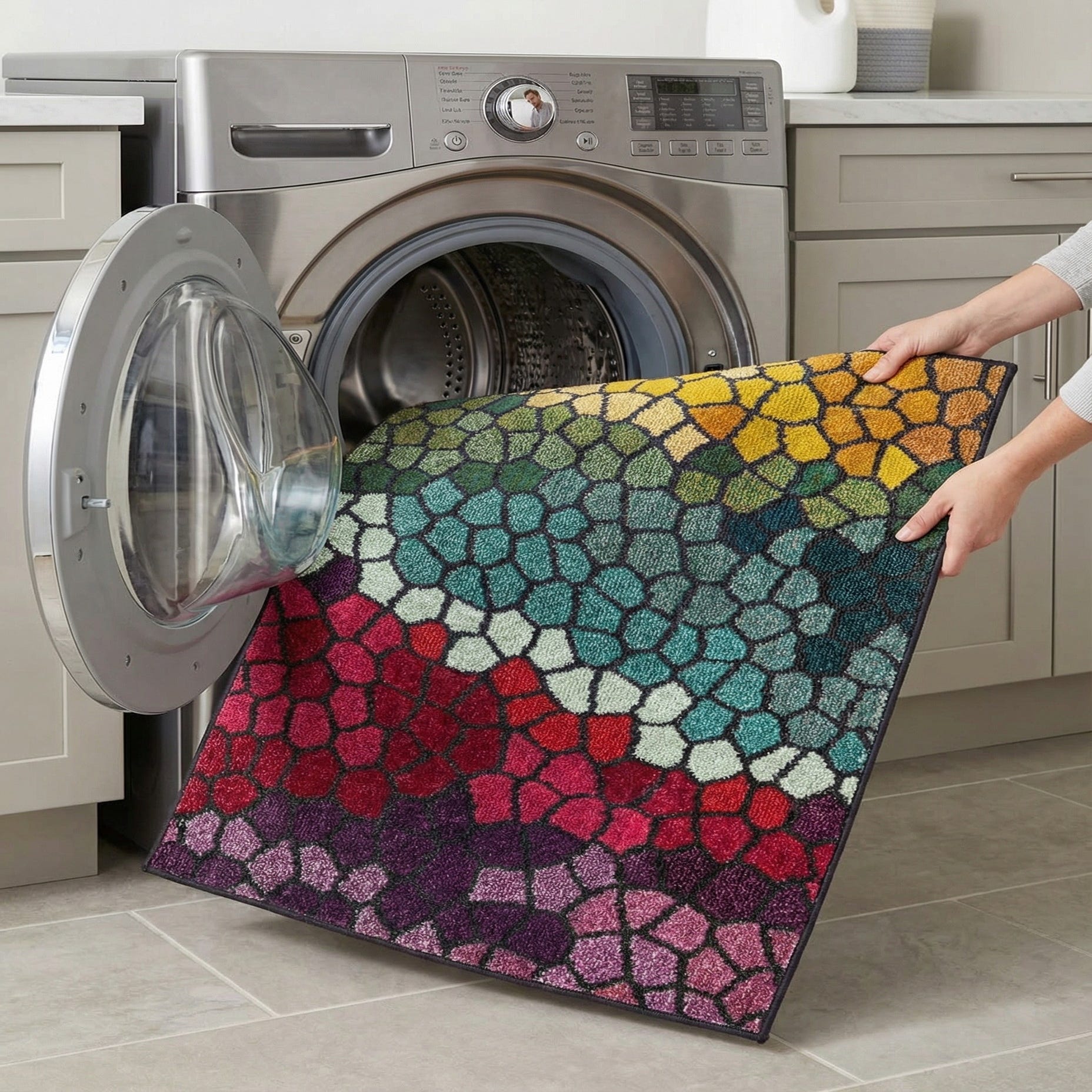 A 3x5 rectangular multi-colored rug with an abstract mosaic pattern in vibrant reds, yellows, greens, and blues, ideal for a kitchen or entryway.