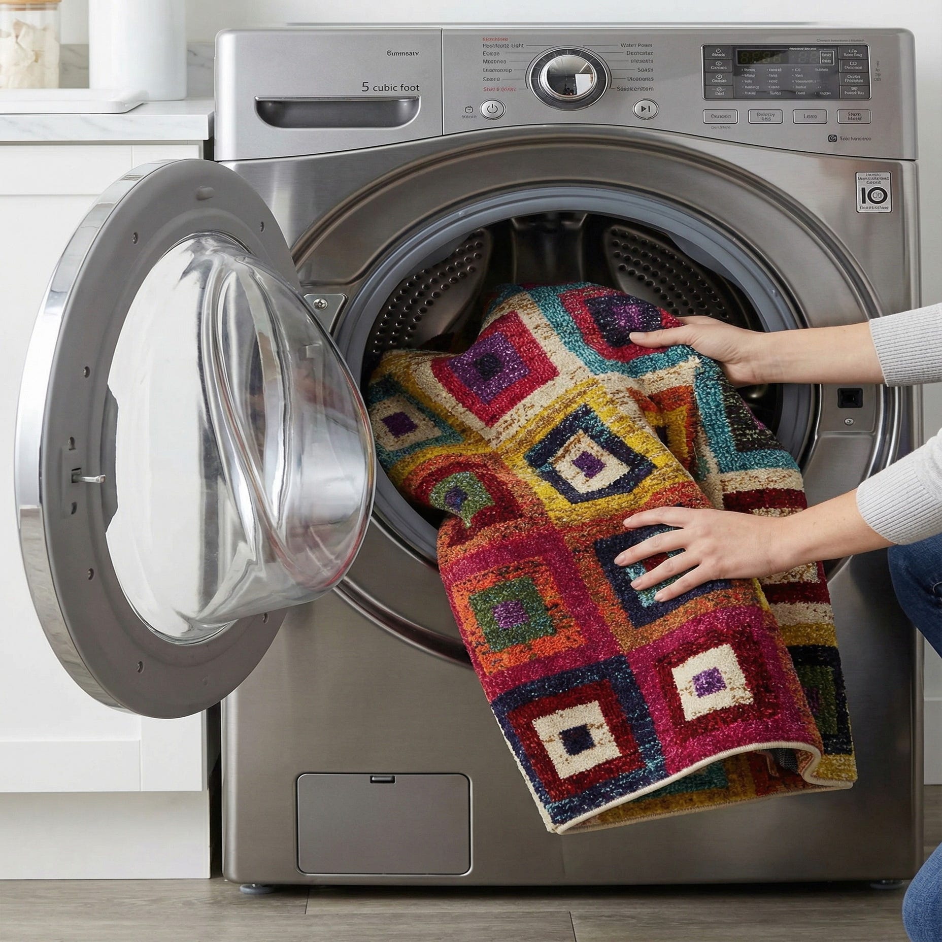 The lively palette and geometric layout work well in contemporary and eclectic interiors—pair it with a neutral sofa and navy or teal accents to bring the room together, or layer it with mid-century wood furniture and brass details for a modern-retro look. It also fits high-traffic spots that need a strong visual anchor: use it in an entryway or hallway, as an accent under a small seating arrangement, or to add color to a home office or children's room.