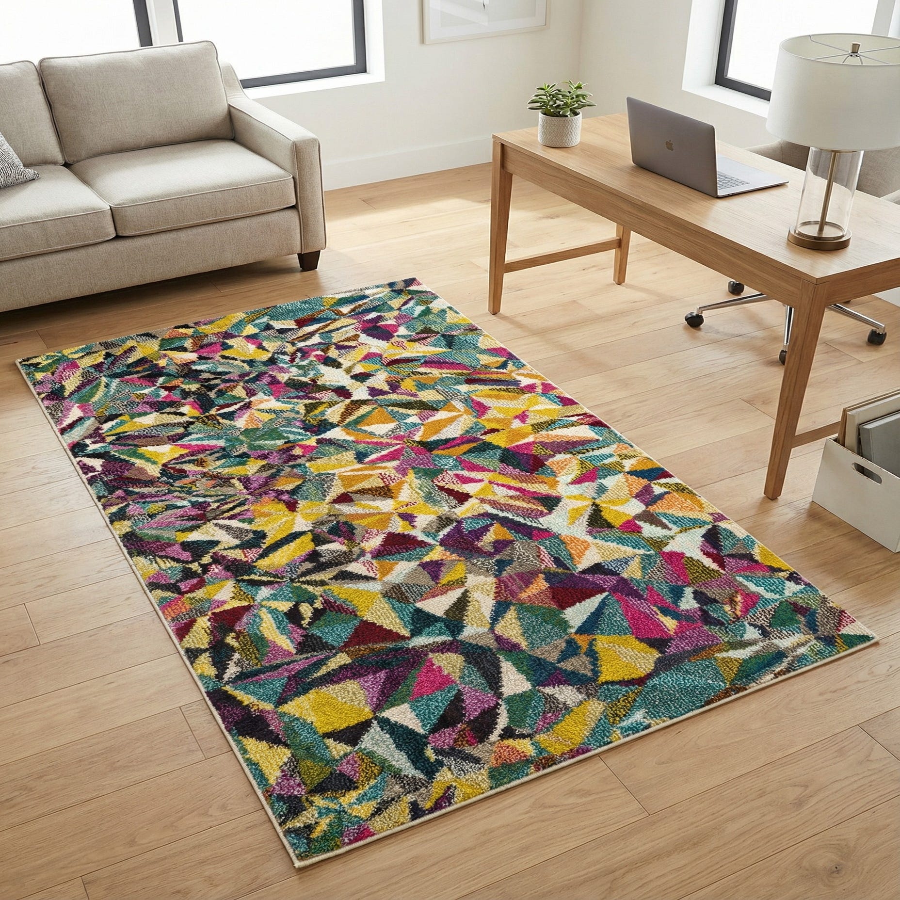 A lively geometric mosaic of angular shapes and overlapping facets gives this rug a contemporary, artful look. The palette is bold and layered — navy and light blue blend with teal and beige, while pops of burgundy, purple, red, pink, orange, yellow and puce animate the surface. Set on a multi ground, the pattern reads like a hand-assembled collage of color that creates movement across the floor. Machine-made from 100% polypropylene, the rug has a dense, cut-pile feel that’s soft underfoot with enough texture to add visual depth without overwhelming a room.