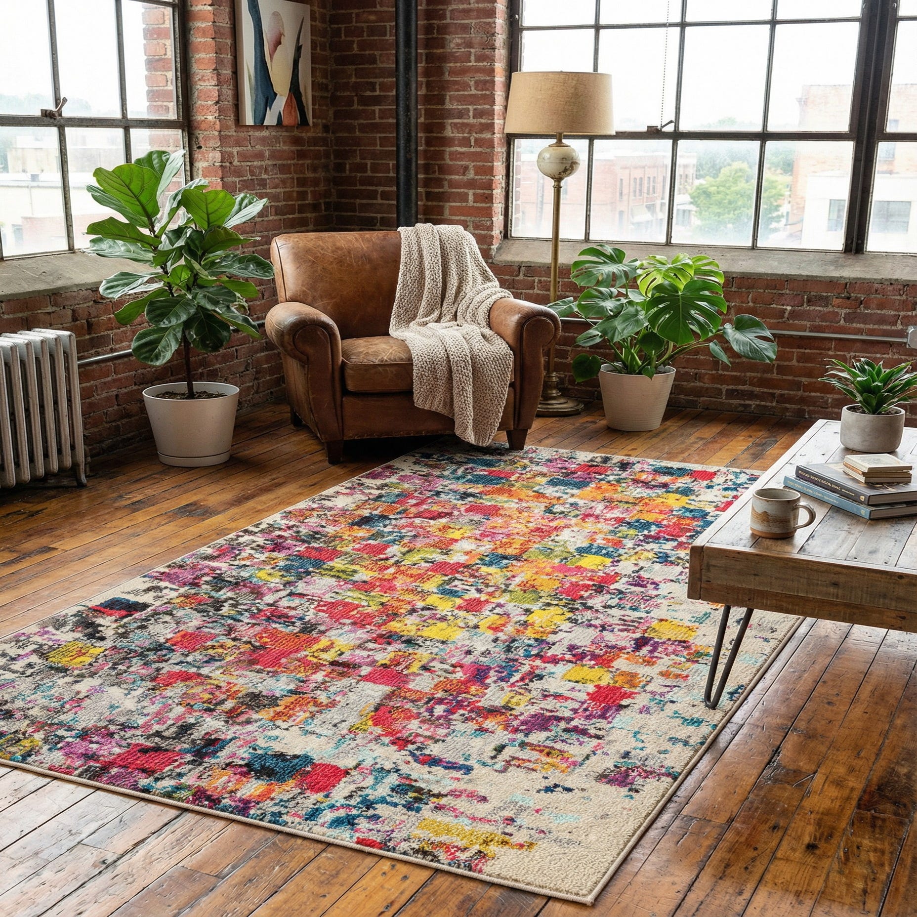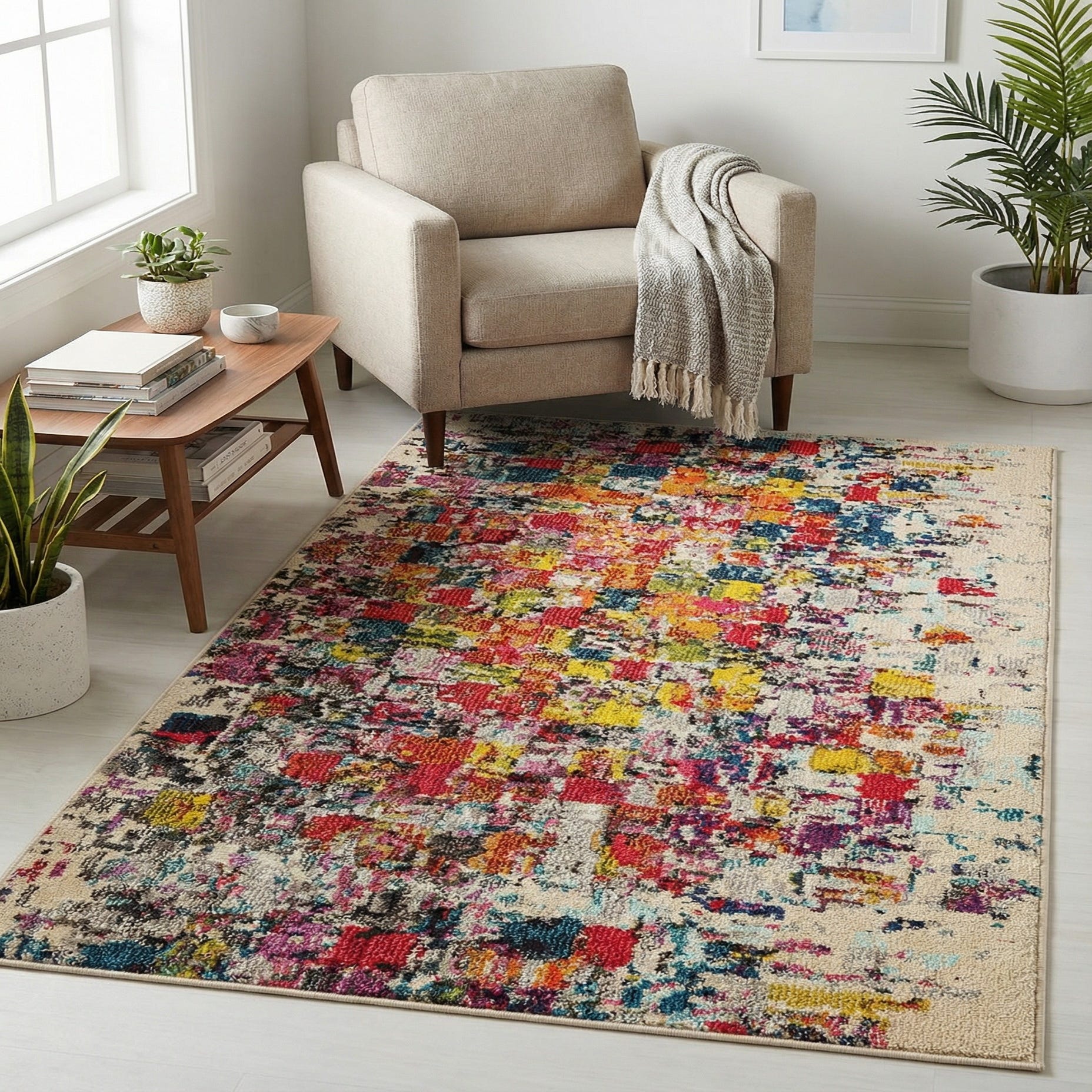 Machine-made of 100% polypropylene, the rug has a low-to-medium pile with a dense, even surface that feels soft underfoot while maintaining clear pattern definition. Use it to anchor a seating area with neutral sofas and mid-century wood pieces, brighten a home office or playroom, or layer it over hardwood in a casual dining nook. The bold palette and modern aesthetic pair well with eclectic, bohemian, and contemporary interiors, and provide a vivid focal point in minimalist spaces.