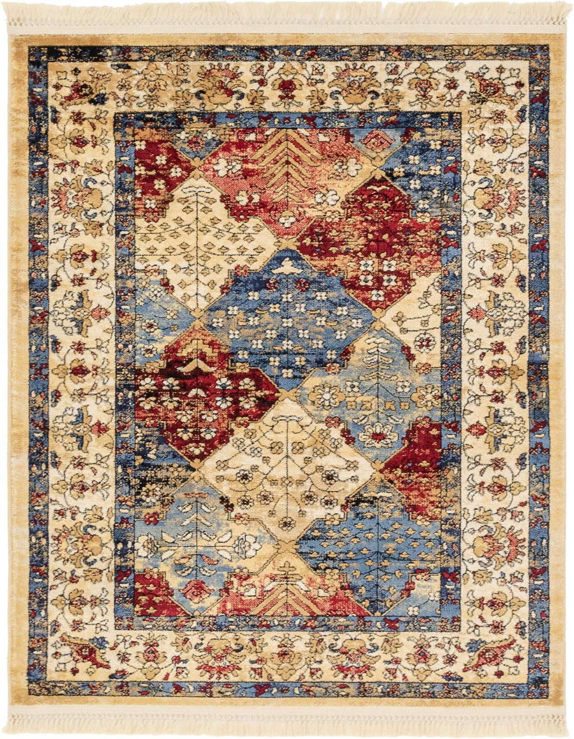Primary color is Multi. Colors in this rug include: Multi, Beige, Black, Blue, Ivory, Red.