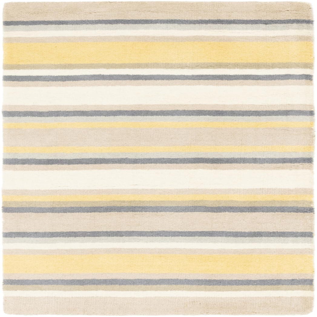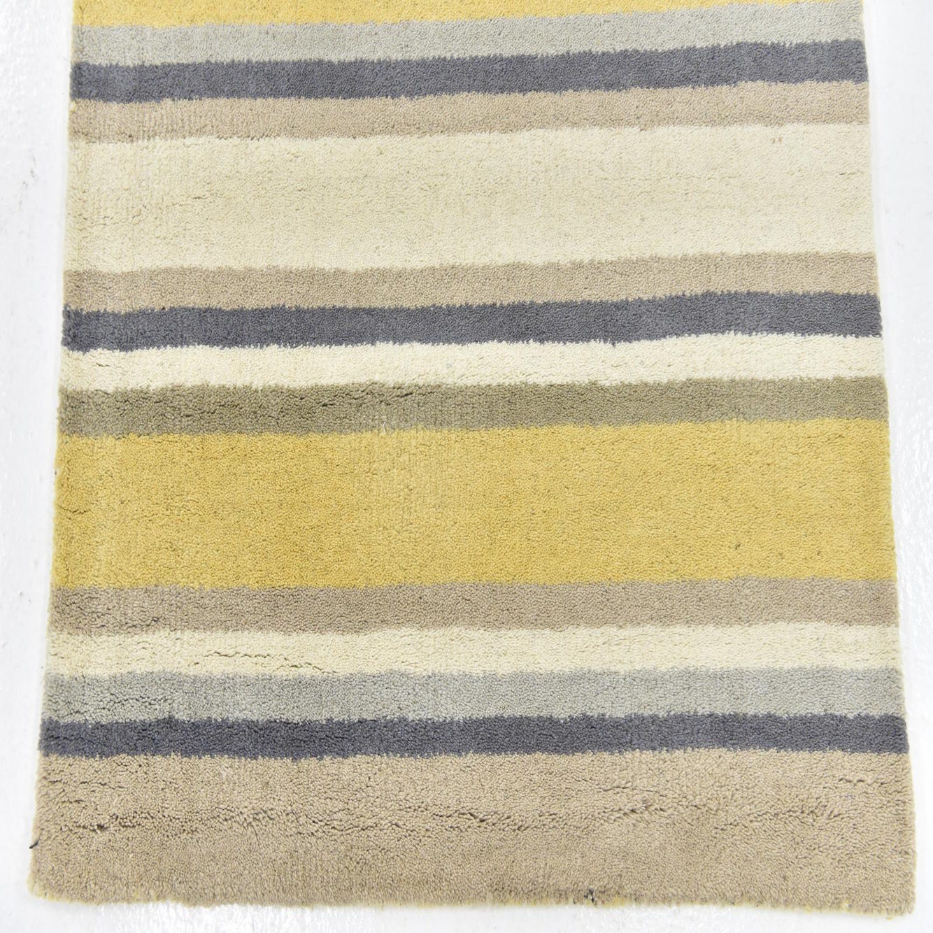 Crafted from 100% wool, the rug is hand-tufted, giving it a plush, soft texture that is appealing underfoot while ensuring durability for everyday use. The balance of neutral colors accented with a distinct yellow stripe allows this piece to serve as a vibrant yet unobtrusive accessory, capable of complementing a wide range of interior themes.