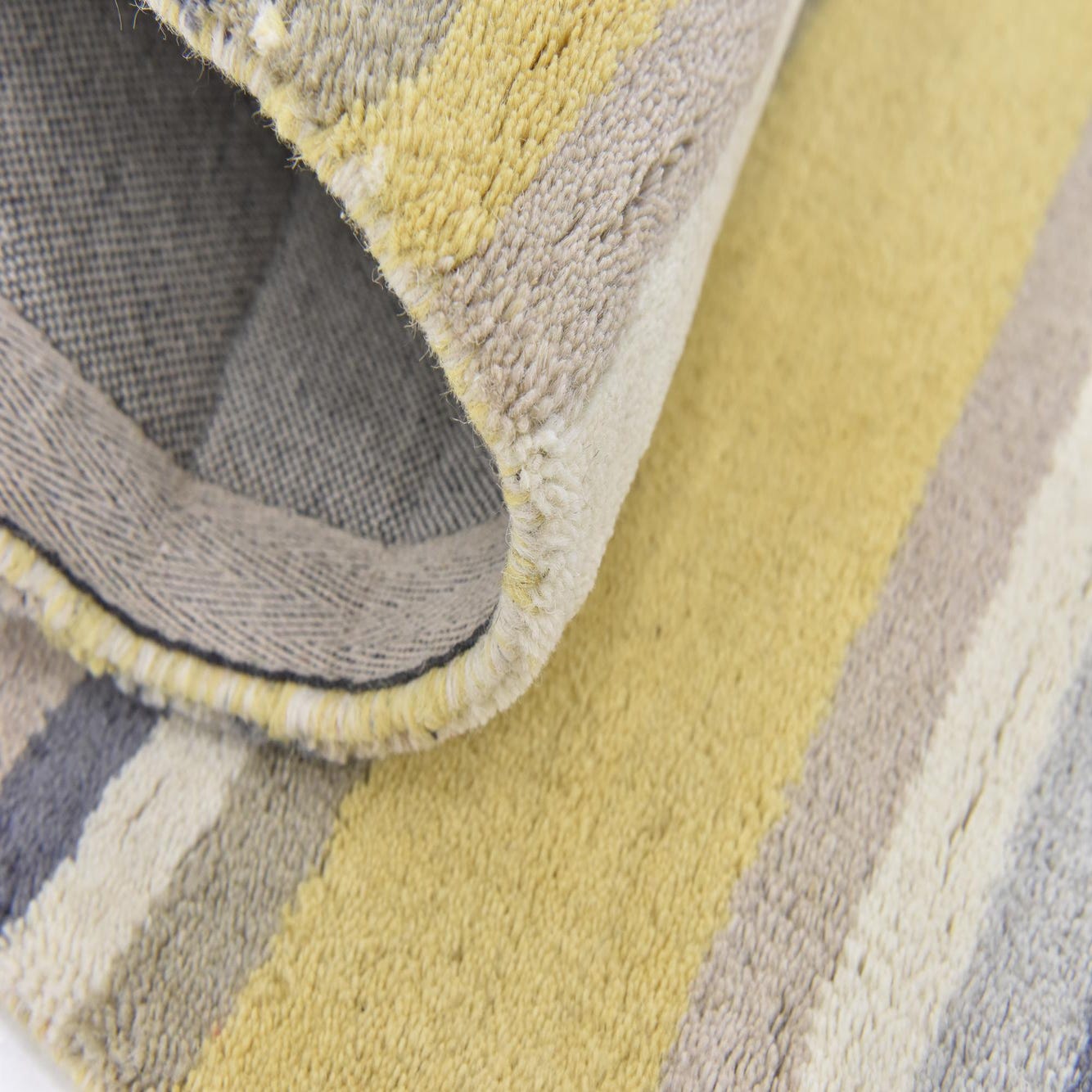 A 3x5 rectangular Luna rug with a multi-colored stripe pattern, featuring bands of yellow, cream, beige, and grey wool.
