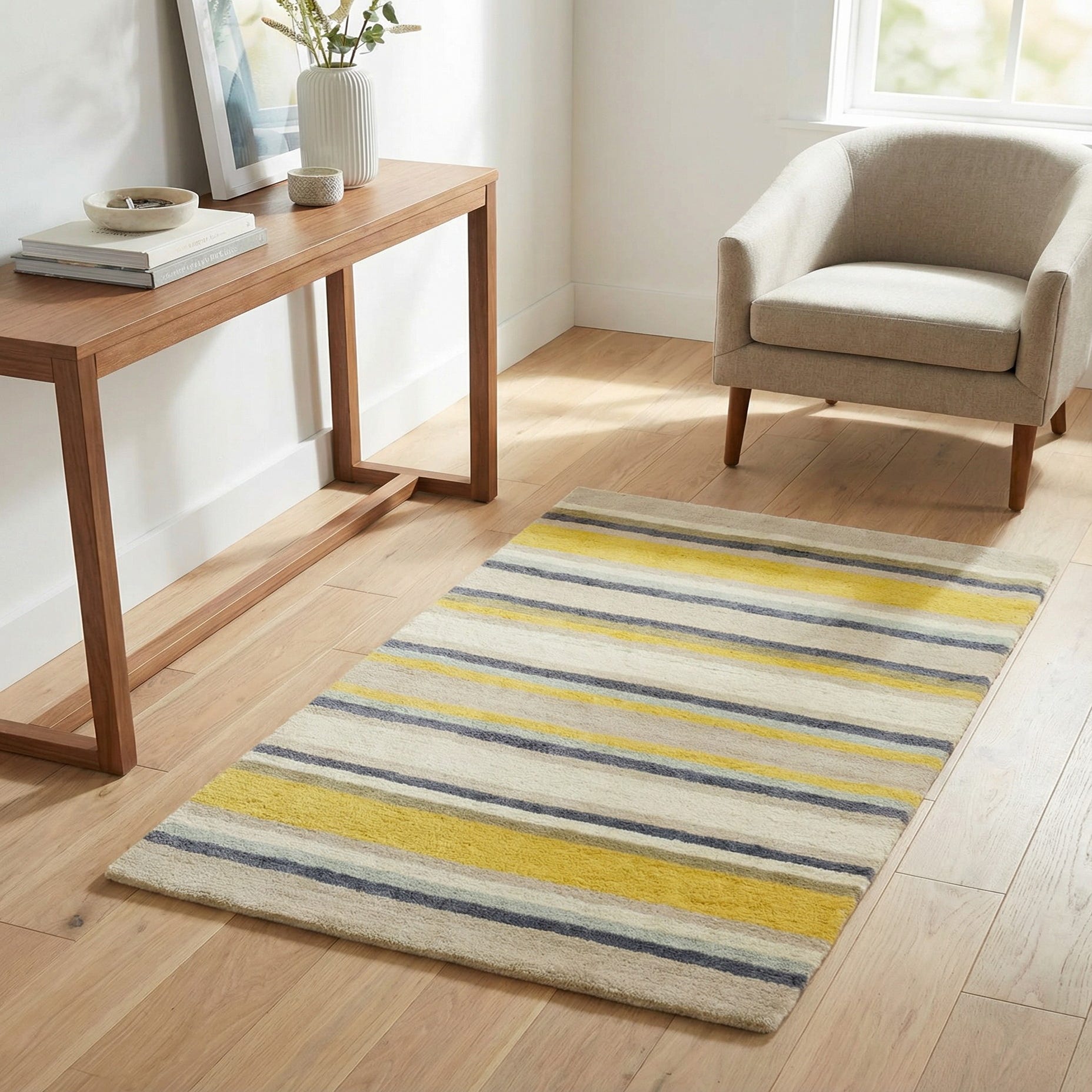 Hand-tufted in 100% wool, the pile feels plush and springy underfoot with a substantial, cozy hand. The tactile density adds warmth and a bit of acoustic dampening for everyday rooms. Works especially well in casual living rooms, a bright entryway, a child’s room or home office; pair it with light-wood furniture, neutral upholstery, or mid-century and Scandinavian-inspired pieces to let the yellow and blue accents bring subtle energy to the space.