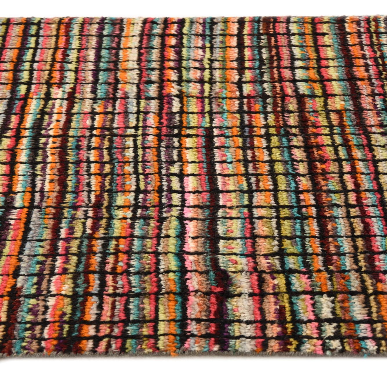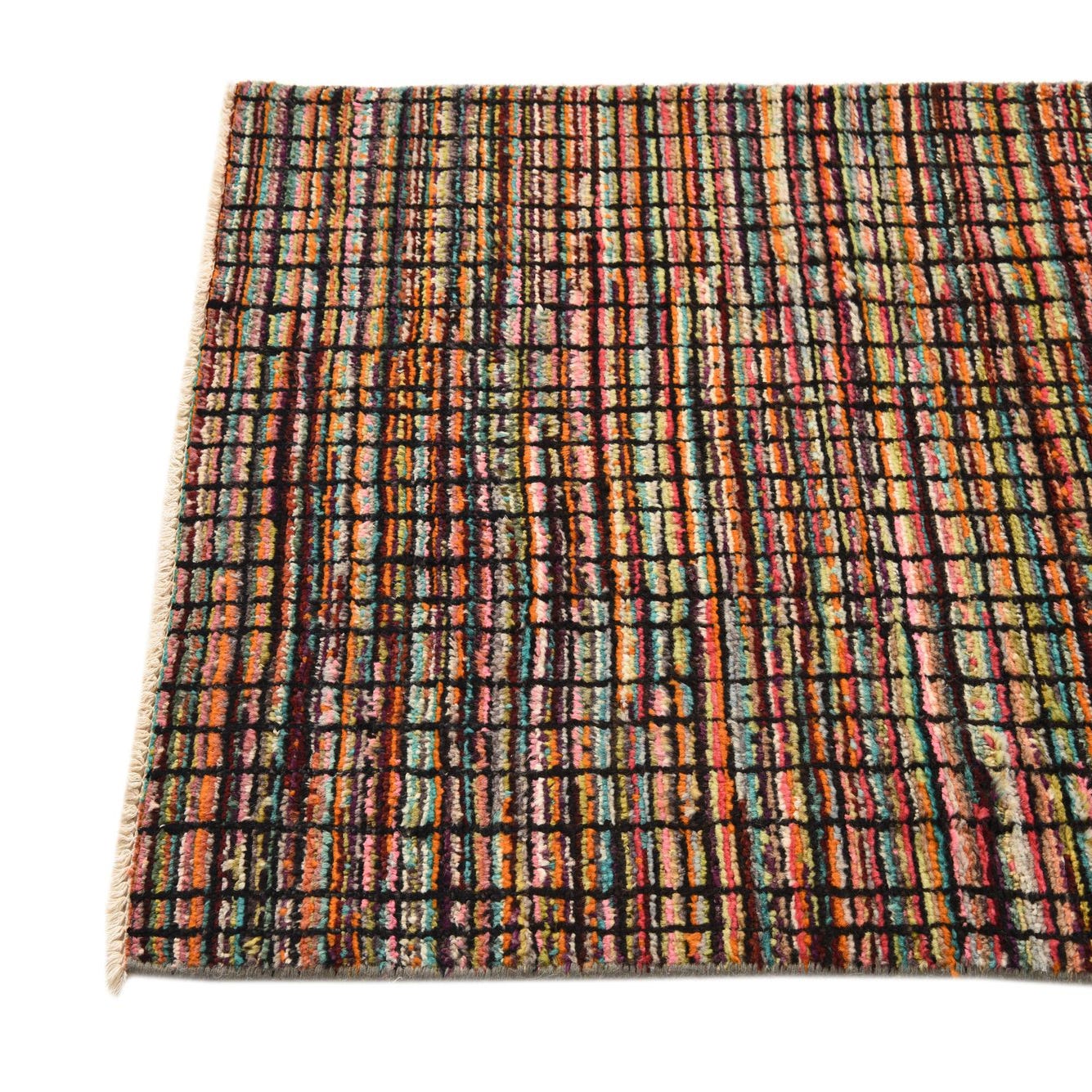 The Modern Ziegler collection presents a 3x5 hand-knotted area rug, meticulously crafted from 100% hand-spun wool. This rug showcases a rich tapestry of color, featuring a multi-hued background complemented by an array of tones including beige, black, blue, brown, burgundy, ivory, light blue, light brown, light green, light salmon, red, purple, pink, violet, turquoise, yellow, olive, and orange. Each color is interwoven to create a vibrant yet balanced visual effect.