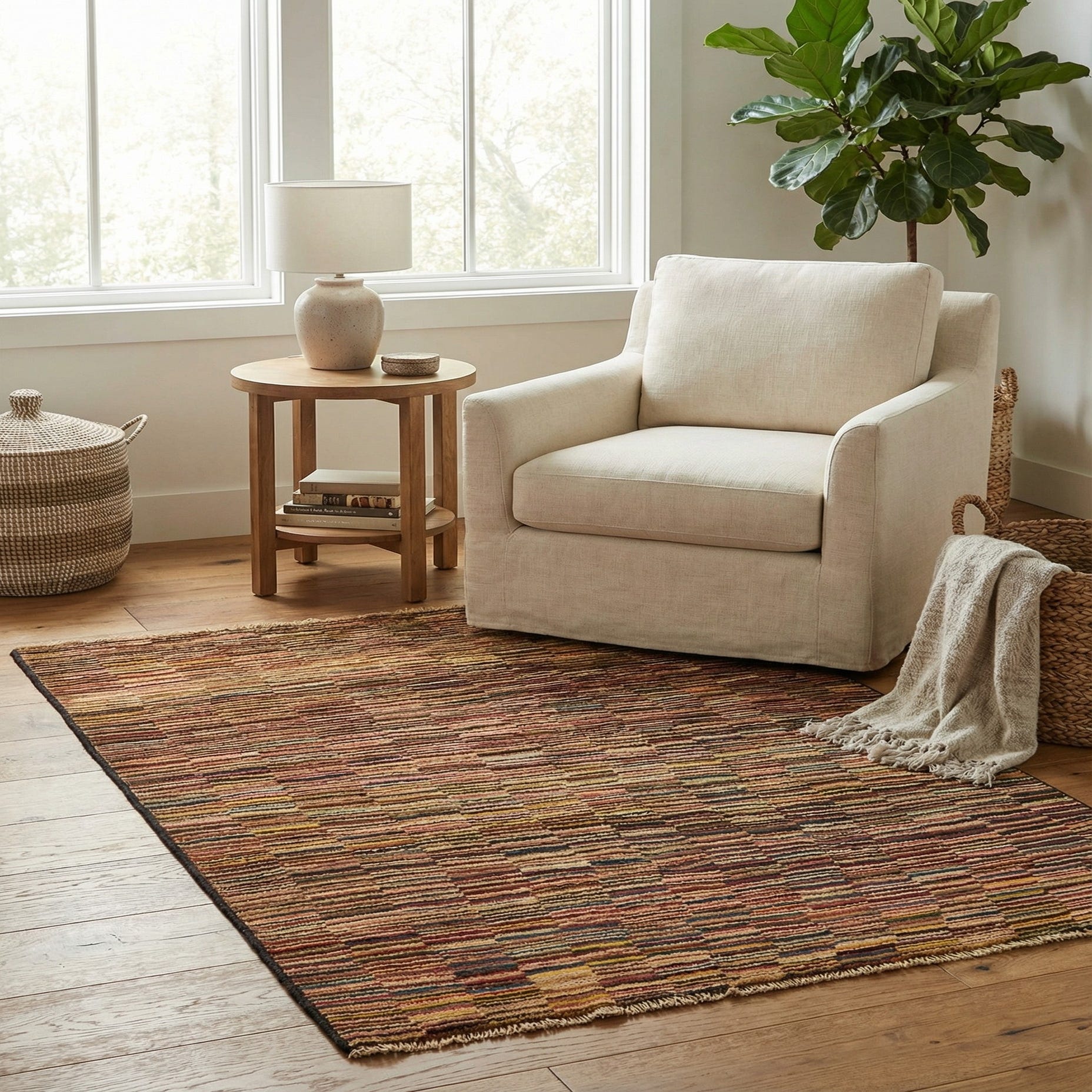 A 3x5 rectangular multi-colored Modern Ziegler rug with horizontal stripes in various earthy tones and vibrant accents.