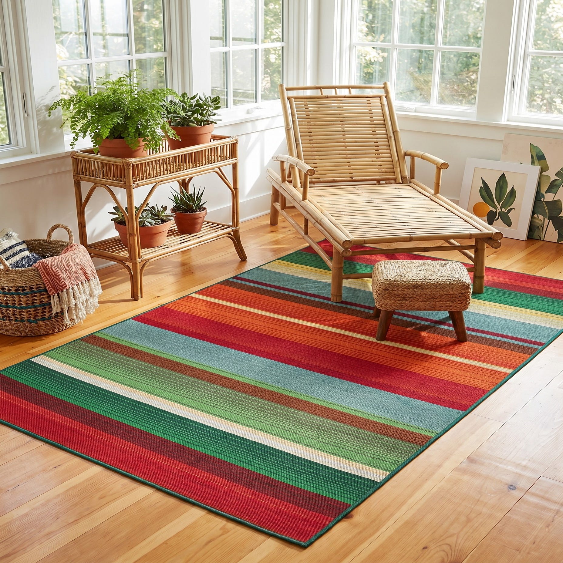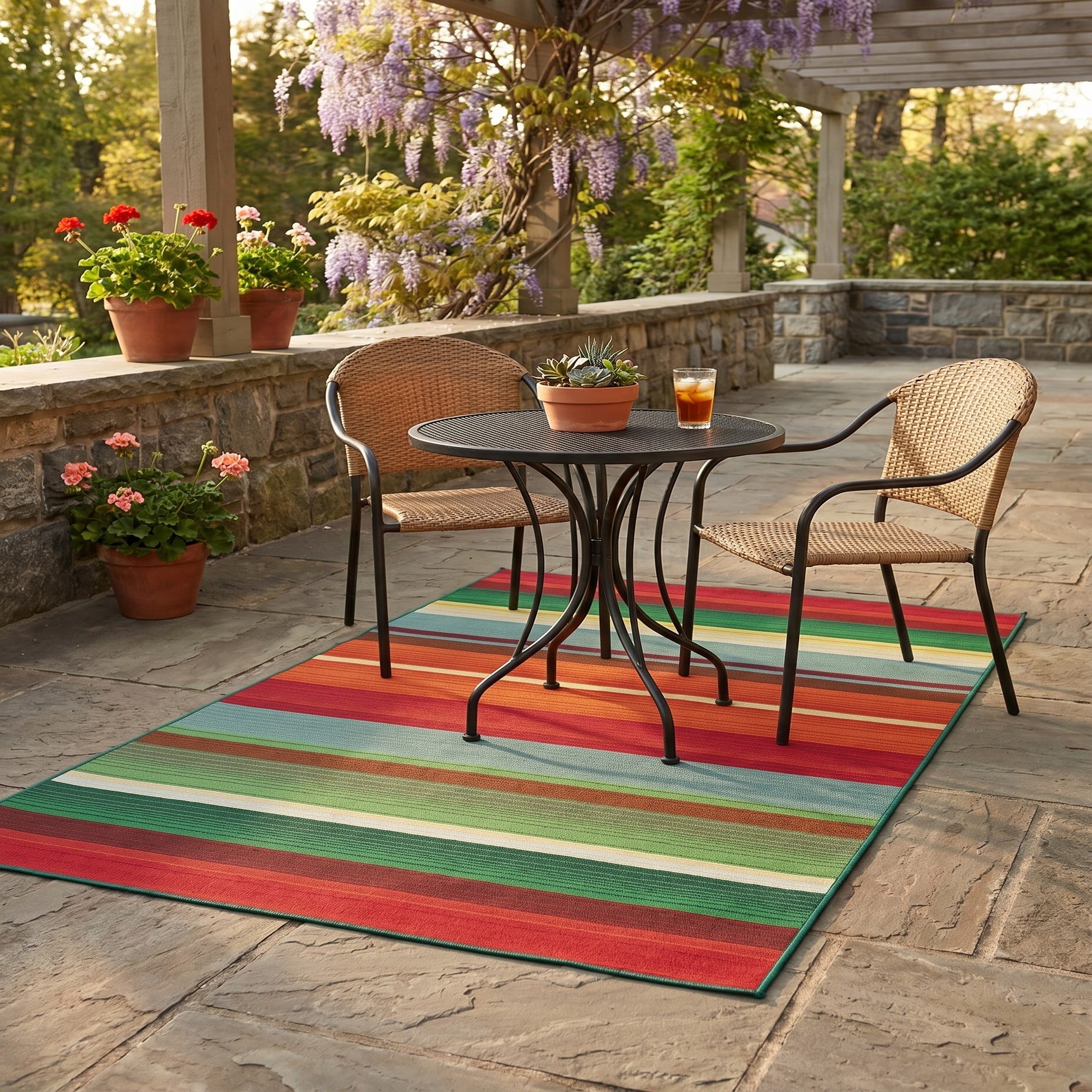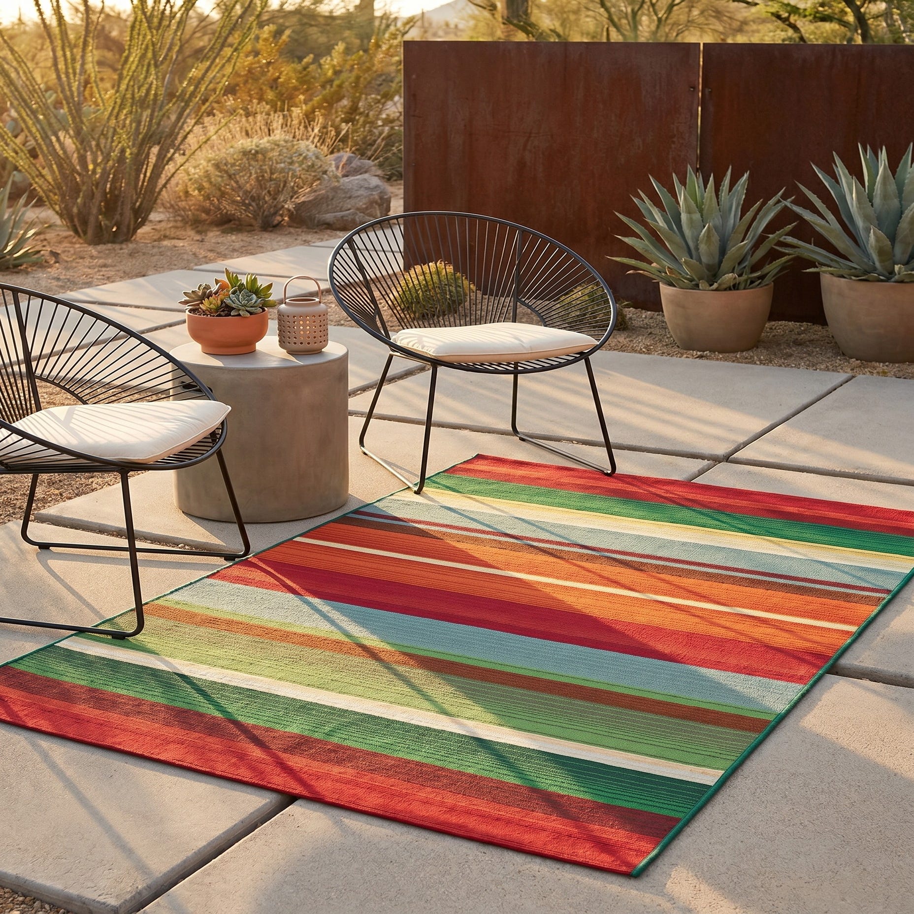 Fell in love with this rug when I saw it on-line for its delightful pattern and vivid colors. It arrived in two days from the day ordered about a week ago. We put it down on our renovated deck today...it is even more awesome than we thought it would be! The colors and pattern outset the colors of the deck perfectly.