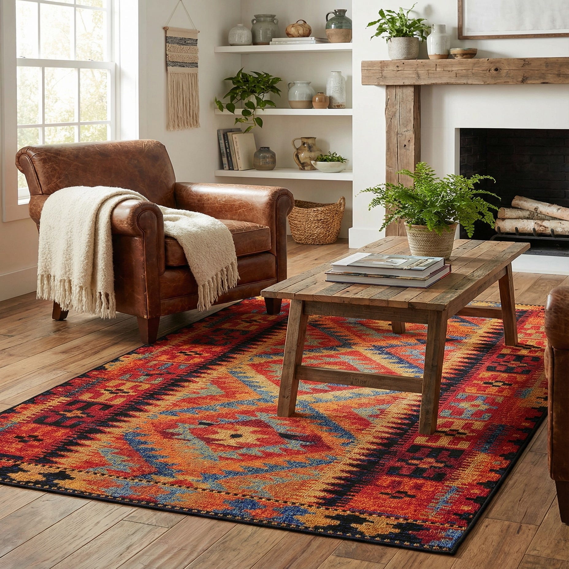This rug brings color and pattern to covered patios, entryways, kitchens, or a casual living room—use it to anchor a seating area or to add interest beneath a small dining set. It pairs well with rustic woods, leather pieces, woven textures and simple linens, and complements Southwestern, bohemian, or eclectic interiors where layered color and geometric pattern are welcome.