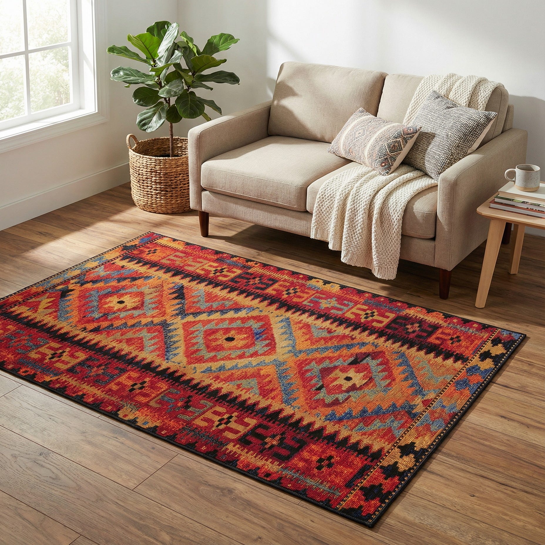 A bold tribal layout of stepped diamonds and angular chevrons forms the centerpiece of this rug, with repeating geometric borders that give the design a hand-woven character. The multi background layers warm reds, rust and terracotta with bright orange and peach highlights, while navy, light blue and tan accents carve out the motifs and add contrast. Machine-made polypropylene construction produces a low-pile, tightly woven surface with a subtle texture and slight sheen that feels firm underfoot and keeps the pattern looking crisp.