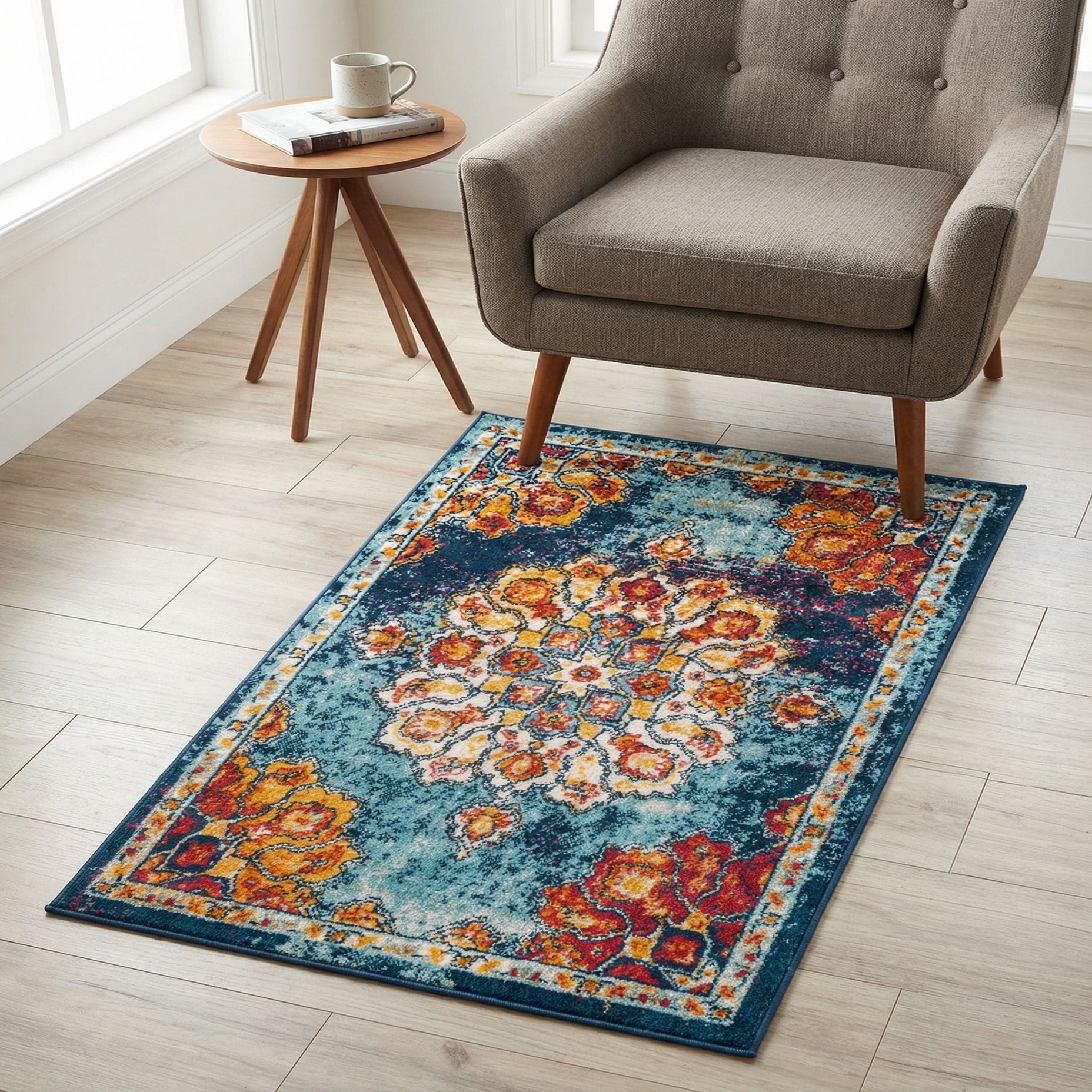 Constructed of 100% polypropylene with a low cut pile, the surface feels smooth underfoot with a subtle, low-profile loft that holds the pattern definition well. The durable weave and clear color saturation make this rug a versatile accent—place it in a living area beneath a coffee table to anchor seating, layer it at the foot of a bed for a pop of color in a bedroom, or use it in an entry or small dining nook to introduce pattern and warmth. It pairs especially well with mid-century modern furnishings, bohemian textiles, or a transitional palette that mixes traditional motifs with contemporary finishes.