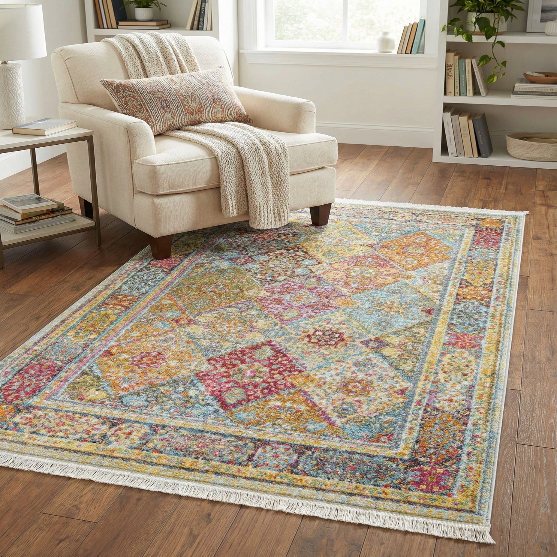 A lively, vintage-inspired medallion pattern fills this rug with overlapping diamond motifs and miniature floral elements. The multi background blends patches of blue, light blue, burgundy, gold, orange, red and pink into a softly distressed field, while a narrow border punctuated by rounded cartouches frames the design. The low-contrast, worn-in look creates layered color depth that reads like a well-traveled heirloom, and short fringe at the ends adds a subtle finishing detail.