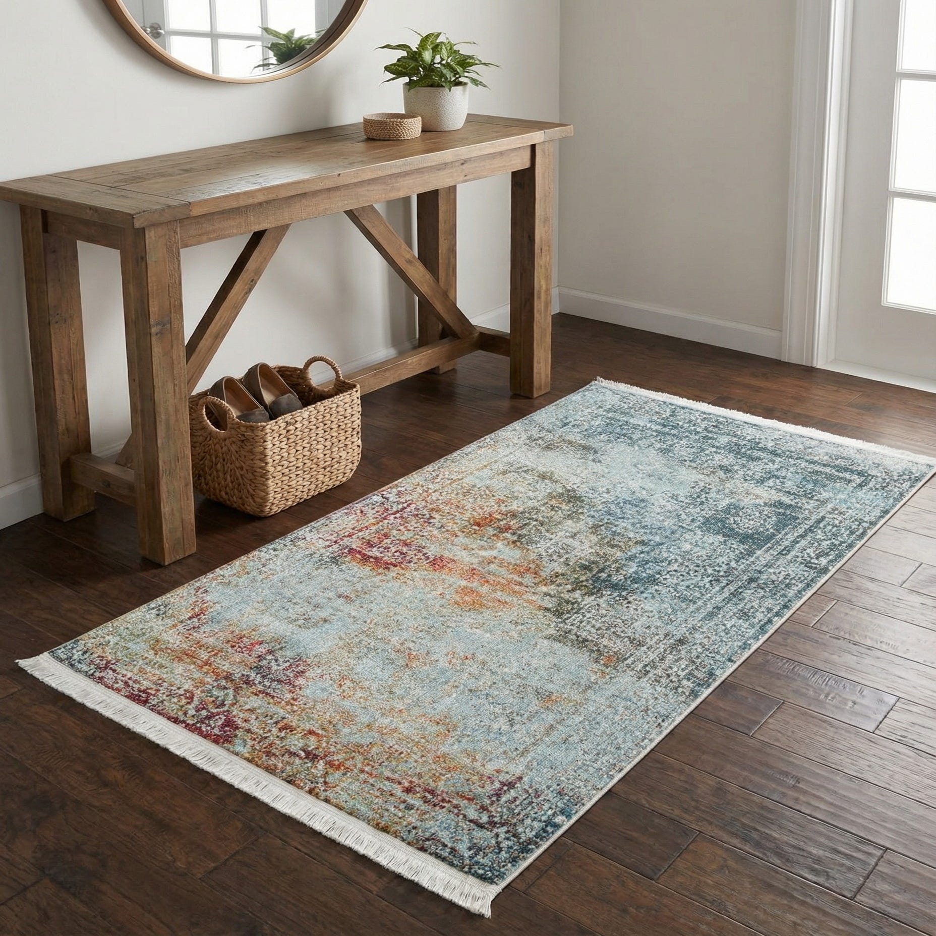 A soft, abstract motif spreads across a multi-hued ground, blending light blue and blue with touches of gray, olive, green, orange, red and ivory for a layered, painterly effect. The design reads as a gently distressed field with subtle border hints and pops of warmer tones that add depth without overwhelming the surface. Machine-made of 100% polypropylene, the rug has a low-profile pile that feels smooth underfoot, holds its shape in everyday use and is finished with short fringed ends for a casual, finished look.