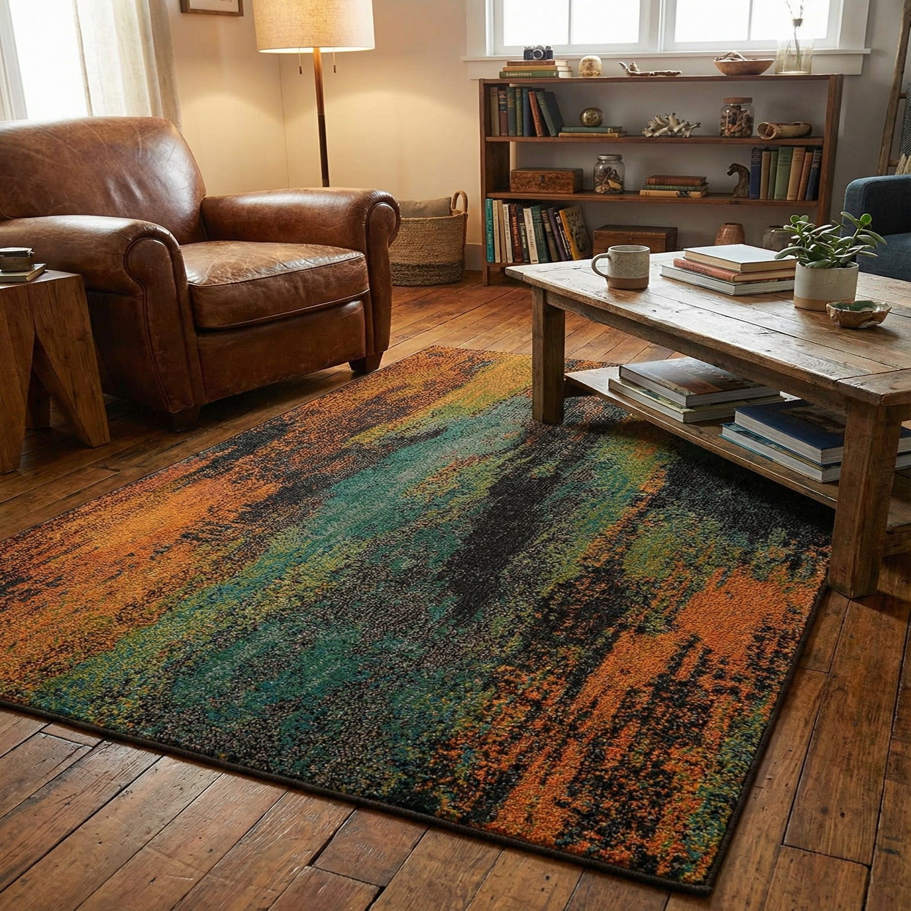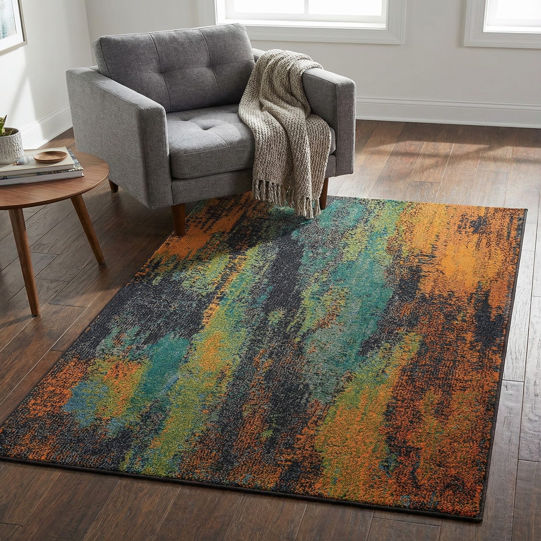 Machine made of 100% polypropylene, the rug has a low-profile pile with a dense, even surface that feels smooth underfoot and offers subtle texture. Its color palette and modern pattern work well in an urban loft living room, a home office where you want a creative focal point, or an entryway that benefits from bold color. It also pairs nicely with industrial metal furnishings, mid-century wood pieces, or a neutral sofa to add warmth and visual interest.