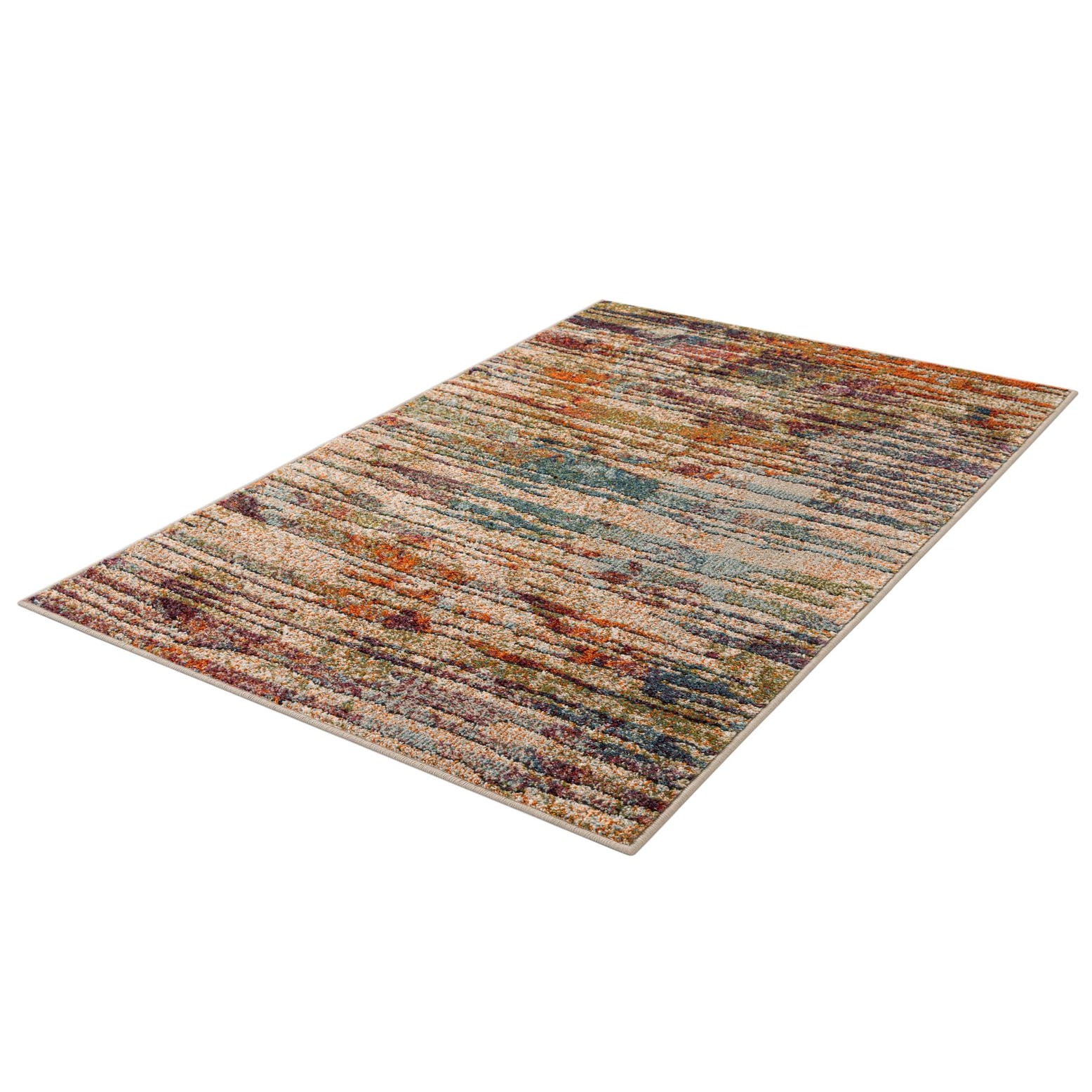 A multi-colored 3x5 rectangular area rug with an abstract, textured stripe pattern in shades of orange, blue, green, and beige.