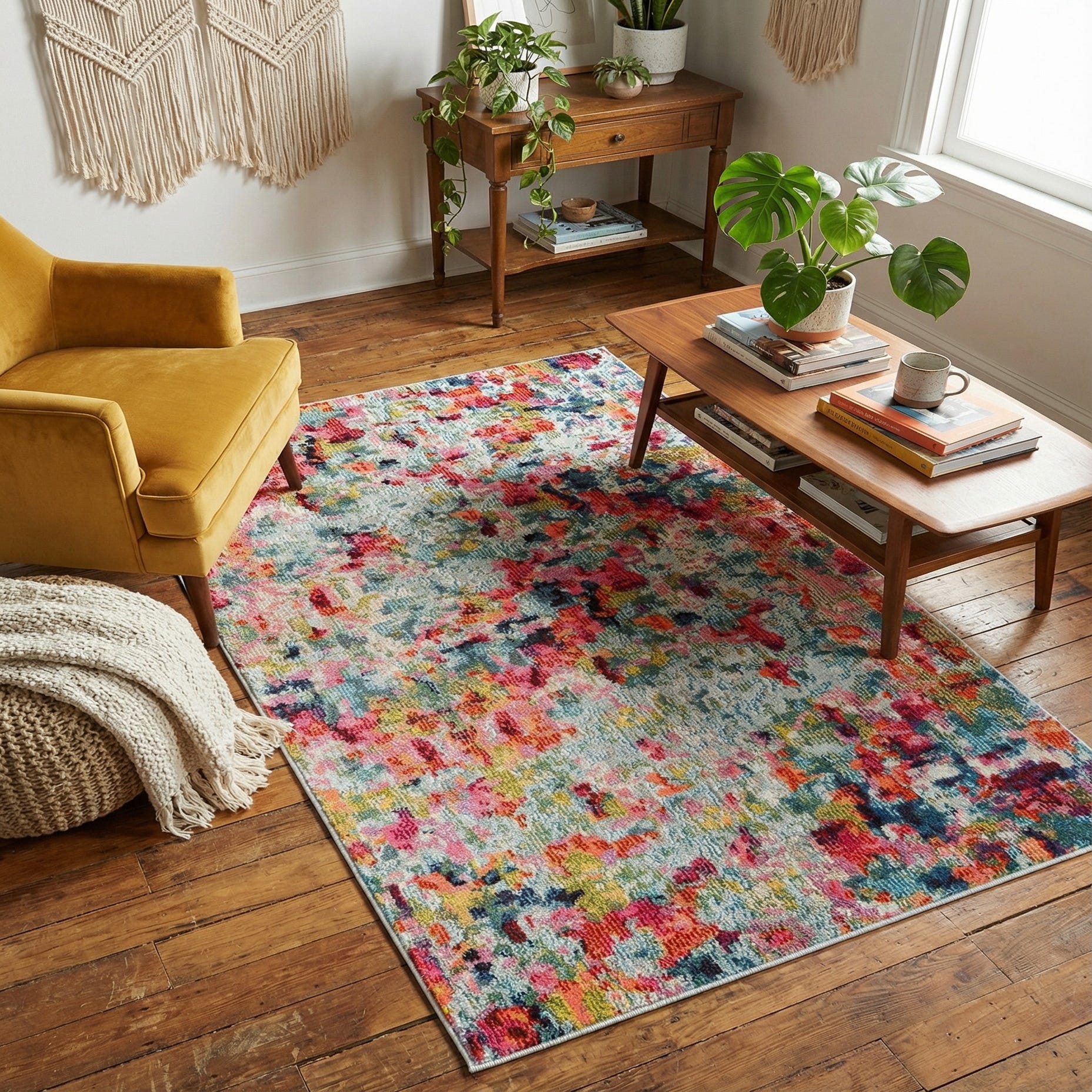 This rug brings energy to modern and eclectic interiors: place it under a neutral sofa to introduce color without overwhelming the space, use it in a home office to warm a hard-surface floor, or layer it in a boho bedroom to complement mixed textiles and warm wood tones. It also works well in entryways or small seating nooks where a burst of pattern and color will make an immediate impact.